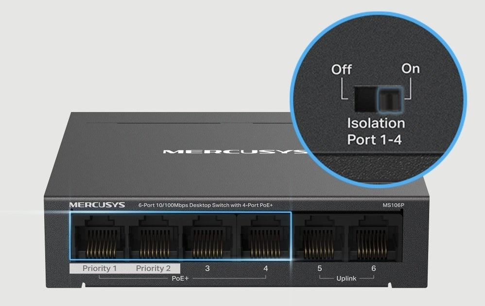 Prepínač MS106P disponuje viacerými režimami, ktoré zvyšujú bezpečnosť a stabilitu siete. Režim izolácie umožňuje oddeliť prevádzku medzi portami, čím sa predchádza nežiaducemu prenosu dát medzi zariadeniami. Režim Extend predlžuje dosah PoE prenosu až na 250 metrov, čo je ideálne pre rozsiahlejšie kamerové systémy. Navyše, funkcia PoE Auto Recovery automaticky reštartuje neodpovedajúce zariadenia napájané cez PoE, čím sa zvyšuje spoľahlivosť siete.