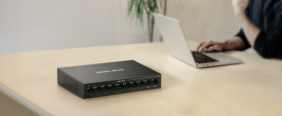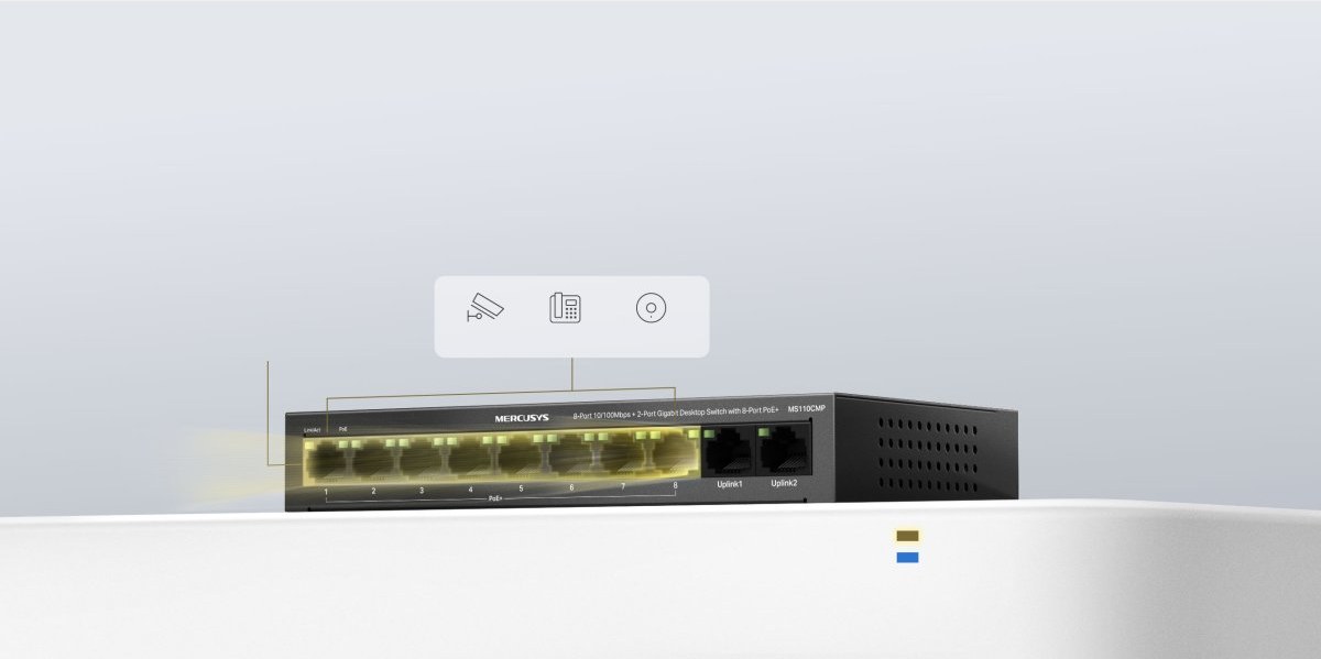 Mercusys MS110CMP je výkonný a zároveň cenovo dostupný sieťový prepínač navrhnutý pre malé kancelárie, domácnosti a kamerové systémy. Vďaka ôsmim PoE+ portom a dvom gigabitovým portom poskytuje stabilné a rýchle pripojenie pre rôzne zariadenia – od IP kamier až po prístupové body. Jeho jednoduché „plug and play“ riešenie umožňuje okamžité nasadenie bez potreby zložitej konfigurácie.