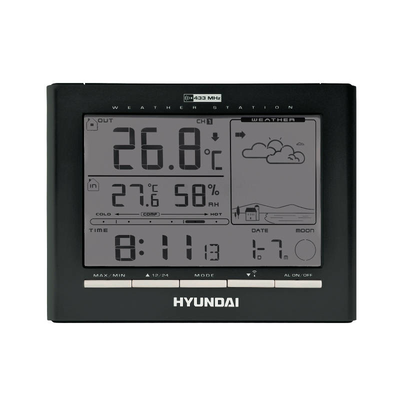 Vkusná černá meteostanice Hyundai WSC 2180 vám bude dobrým rádcem ohledně počasí, ale zároveň elegantní doplněk vašeho interiéru.