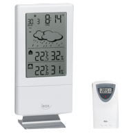 Osobná meteo stanica. Vonkajší aj izbový digitálny teplomer s hodinami a predpoveďou počasia postaviteľný na stôl alebo montovateľný na stenu. V miestnosti meria teplotu a vlhkosť vzduchu 0°C až +50°C, 10% až 95%, vonkajší bezdrôtový senzor meria teplotu -20°C až +60°C, dosah senzora do 30m, pamäť min/max teploty a vlhkosti, optické zobrazenie alarmu mrazu, grafické zobrazenie stavu počasia, meranie a trend tlaku, presný čas nemeckého vysielača DCF77, dátum a deň v týždni, indikátor vybitej batérie. Napájanie 2 x AA+2 x AA. batéria. Rozmery 174 x 95 x 32 mm bez podstavca Dodávaný s batériamiwww.irox.com