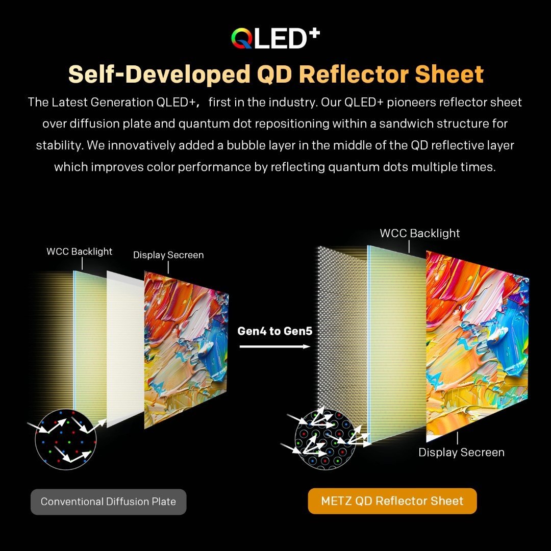Najnovšia generácia QLED+, prvá v odvetví! Naše QLED+ ako prvé v odvetví využívajú reflektorovú fóliu nad difúznou doskou a presunutie kvantových bodov v sendvičovej štruktúre pre väčšiu stabilitu. Inovatívne sme pridali bublinkovú vrstvu uprostred QD reflexnej vrstvy, ktorá zlepšuje farebný výkon tým, že viackrát odráža kvantové body.