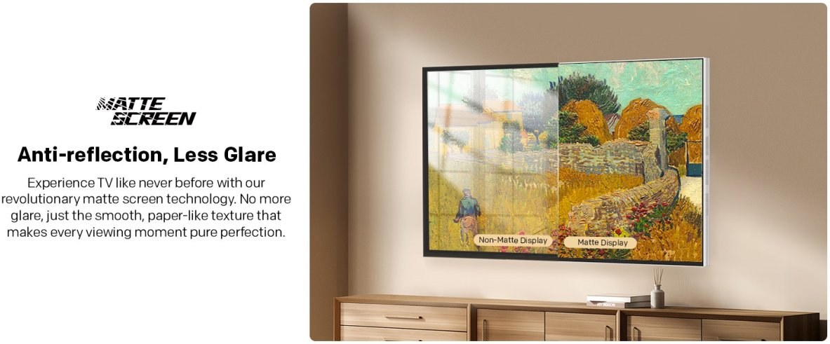 zažite televíziu ako nikdy predtým vďaka našej revolučnej technológii matného displeja. Žiadne odlesky, len hladká textúra pripomínajúca papier, ktorá zaručuje dokonalý zážitok zo sledovania.