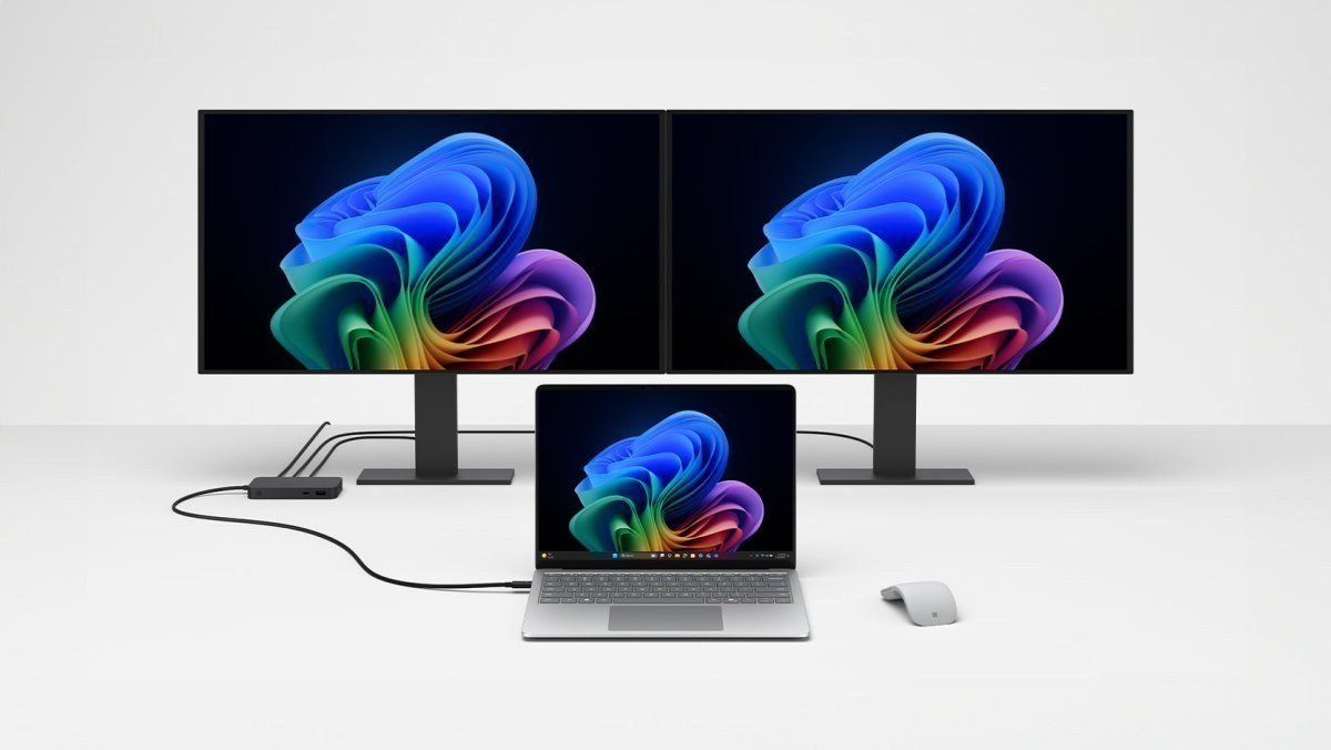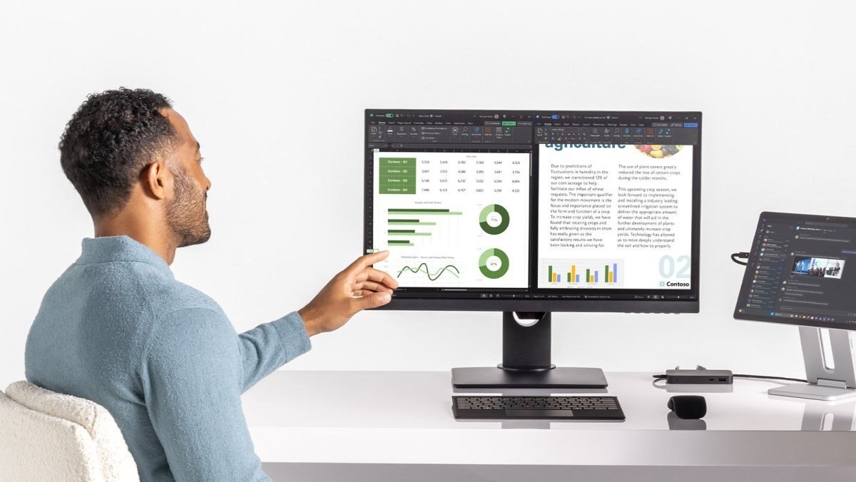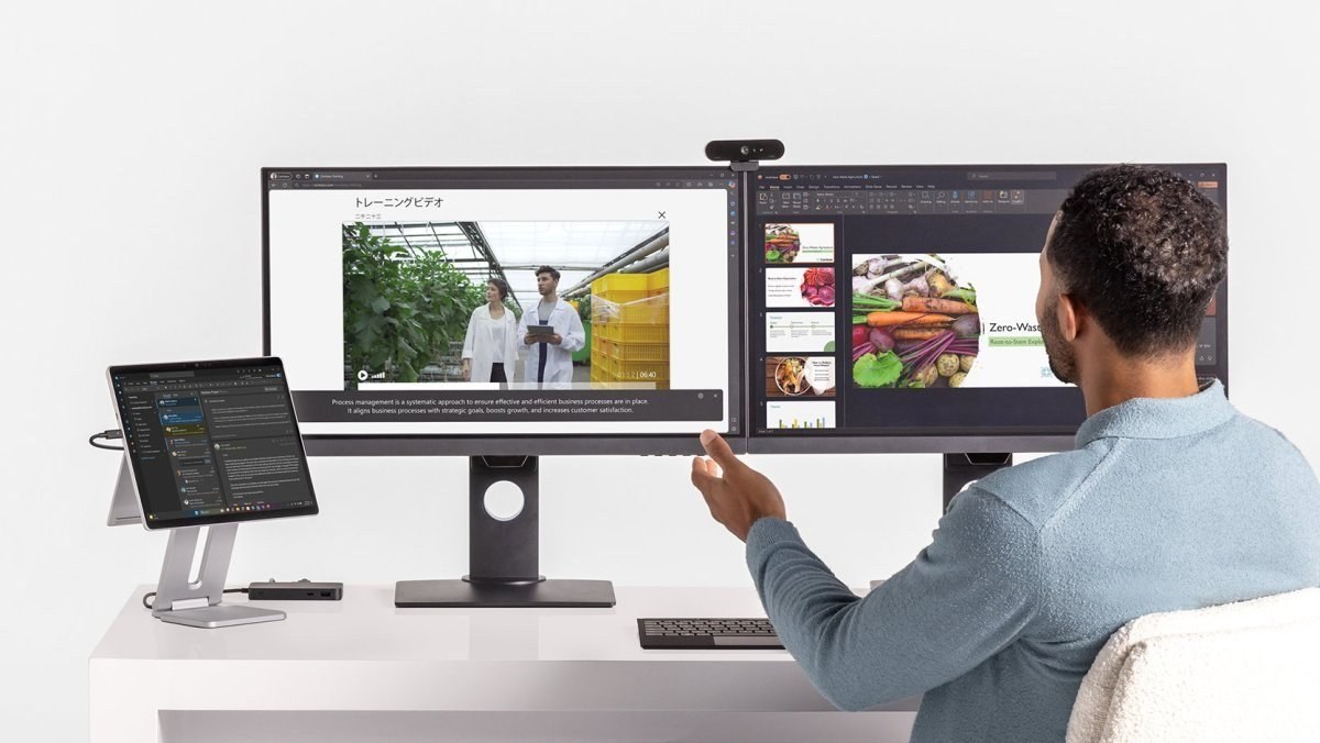 Surface USB4 Dock umožňuje rozšíriť vizuálny pracovný priestor a pracovať súčasne na troch obrazovkách.