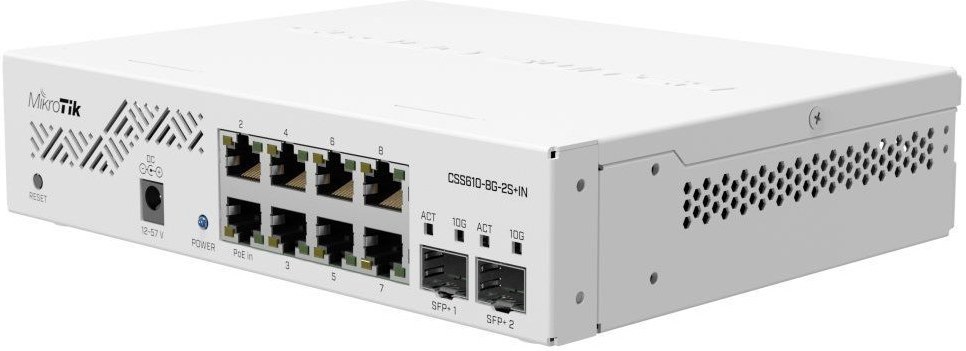 Cloud Smart Switch s ôsmimi portmi GbE a dvoma slotmi 10G SFP+. Jeho najväčšou výhodou je podpora rozhraní 10 Gbps a jednoduché rozhranie SwOS.Ideálne riešenie pre poskytovateľov internetových služieb aj pre firmy. Pre optické pripojenia je prepínač vybavený dvoma slotmi SFP+ pre optické moduly. Cloud Smart Switch je možné namontovať do 1U racku.