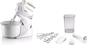 Pätstupnové ovládanie rýchlosti, príkon 400 W, obojstranné tlacidlo turbo, vo výbave šlahaca sa nachádzajú šlahacie metlicky, hnetacie háky, plastový ponorný mixér, nádobka na mixovanie, otocná misa a výkyvný stojan, možno dokúpit mixér, pasírovací kotúc, bielo-krémová