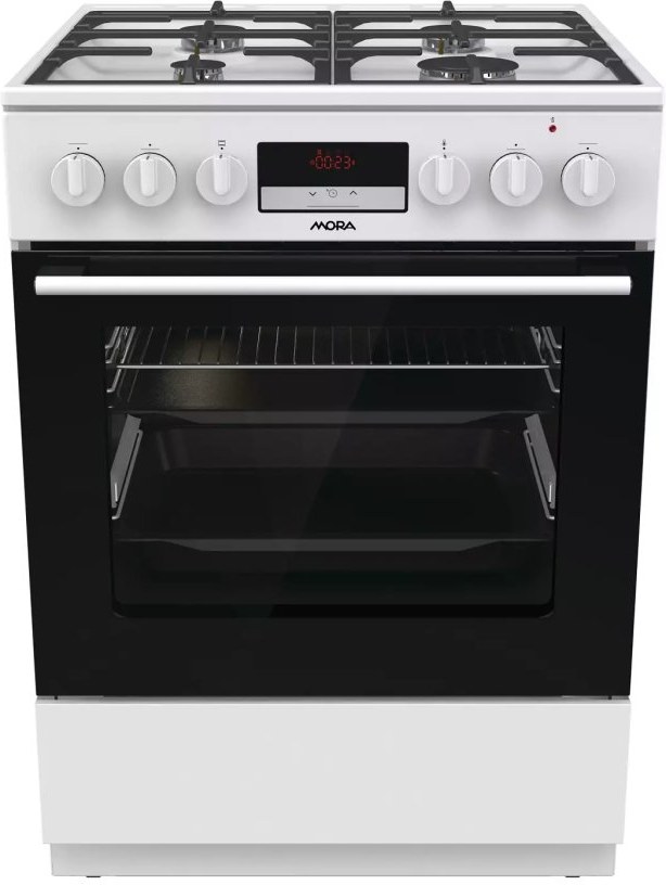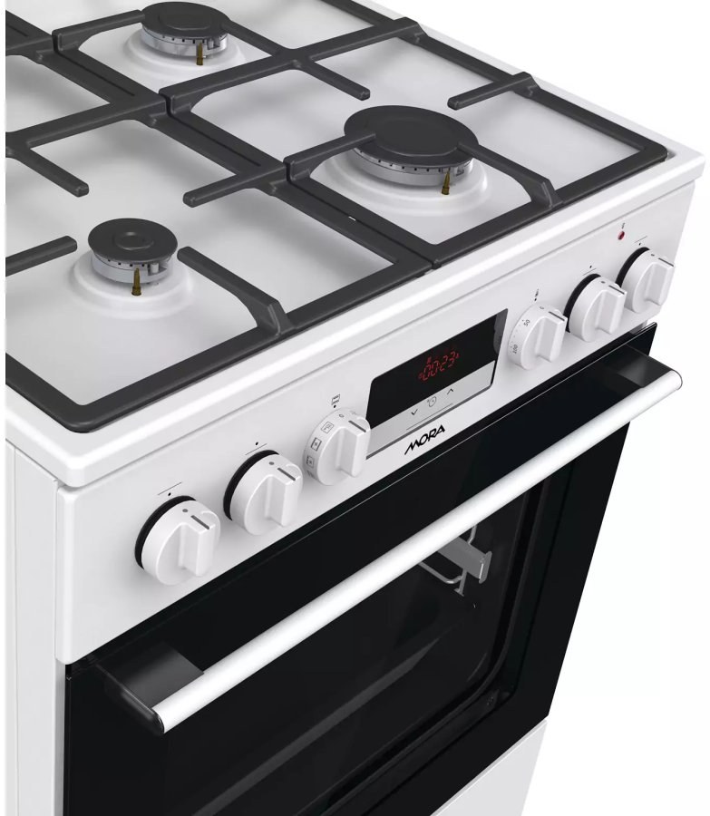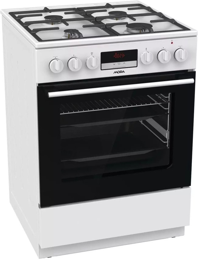 Kombinovaný sporák Mora K 8668 B1W6, v šírke 60 cm, v bielom prevedení s multifunkčnou rúrou v objeme 71 l Vás prekvapí energeticky úspornou triedou A. Plynové horáky s poistkami STOP GAS a integrovaným zapaľovaním sú kryté dvojdielnou mriežkou STABIL PLUS, ktorá zaisťuje vo všetkých smeroch. Vďaka digitálnemu časovému spínaču s hodinami sa Vám už nikdy nespáli obed, táto praktická funkcia Vám prinesie mnoho úžitku. Je možné nastaviť odložený štart a ukončenie pečenia, iba ukončenie pečenia a minútka, samozrejmosťou je nastavený aktuálny čas. Disponuje funkciou pary, ktorú ocenia predovšetkým priaznivci zdravej výživy. Pripravíte s ňou jedlá rýchlo a šetrne, takže si zachovajú maximum vitamínov a stopových prvkov. Ďalej je rúra vybavená 11 programami na pečenie, ktoré sú navrhnuté presne podľa potrieb konkrétnych jedál. Vykúzlite napríklad výbornú pizzu ako z talianskej reštaurácie (program Pizza), pomaly upečiete pečienku a efektívne rozmrazíte hotové porcie jedla. Pokiaľ si radi pochutnávate na hranolkách alebo kuracích nugetách, ale nedopriate si ich tak často kvôli vysokej kalorickej hodnote, môžete tiež skúsiť program pre teplovzdušné fritovanie bez tuku. Hotové jedlá väčšinou volíme vtedy, keď nás tlačí čas. Zvykli ste si, že predhriatie rúry trvá celú večnosť? Na to teraz zabudnite. Táto rúra sa predhreje na 200 °C do 5 minút, čo je oveľa rýchlejšie, než býva zvykom. Nové bezpečné závesy dvierok zaručujú bez Vašej asistencie veľmi tiché a šetrné zatváranie dvierok rúry. Na zvýšenie komfortu obsluhy je rúra vybavená teleskopickým výsuvom, ktoré umožní bezpečnú manipuláciu s pripravovaným jedlom bez toho, aby ste ho museli z rúry vytiahnuť. V spodnej časti sporáka je praktický úložný priestor, do ktorého ľahko uložíte príslušenstvo v podobe roštu, plytkého plechu a MAXI pekáča XXL s objemom až 8 l. Perfektné vyčistenie vnútorného priestoru po každom pečení zaistí funkcia ECO CLEAN, vďaka ktorej odstránite aj väčšie nečistoty bez nutnosti použiť čistiaci prostriedok.Dokonalý prehľad o pečení