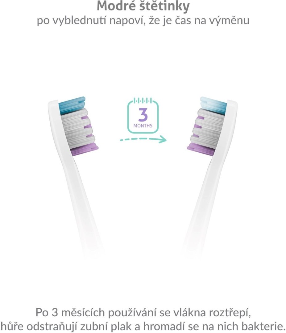 Hlavice vydržia až 3 mesiace používania, potom sa začnú strapkať, strácajú účinnosť a navyše sa na nich hromadia baktérie. Našťastie sú hlavice opatrené modrými štetinami, ktoré po 3 mesiacoch vyblednú a vy tak viete, že je načase hlavice vymeniť.