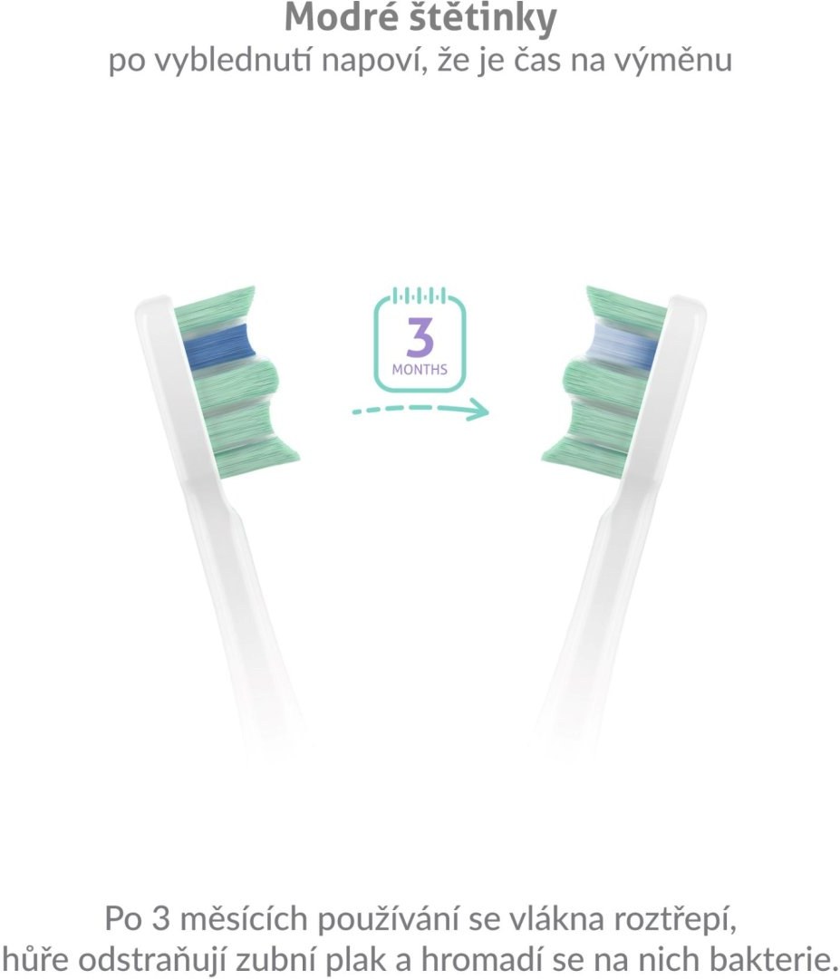 Hlavice vydržia až 3 mesiace používania, potom sa začnú strapkať, strácajú účinnosť a navyše sa na nich hromadia baktérie. Našťastie sú hlavice opatrené modrými štetinami, ktoré po 3 mesiacoch vyblednú a vy tak viete, že je načase hlavice vymeniť.