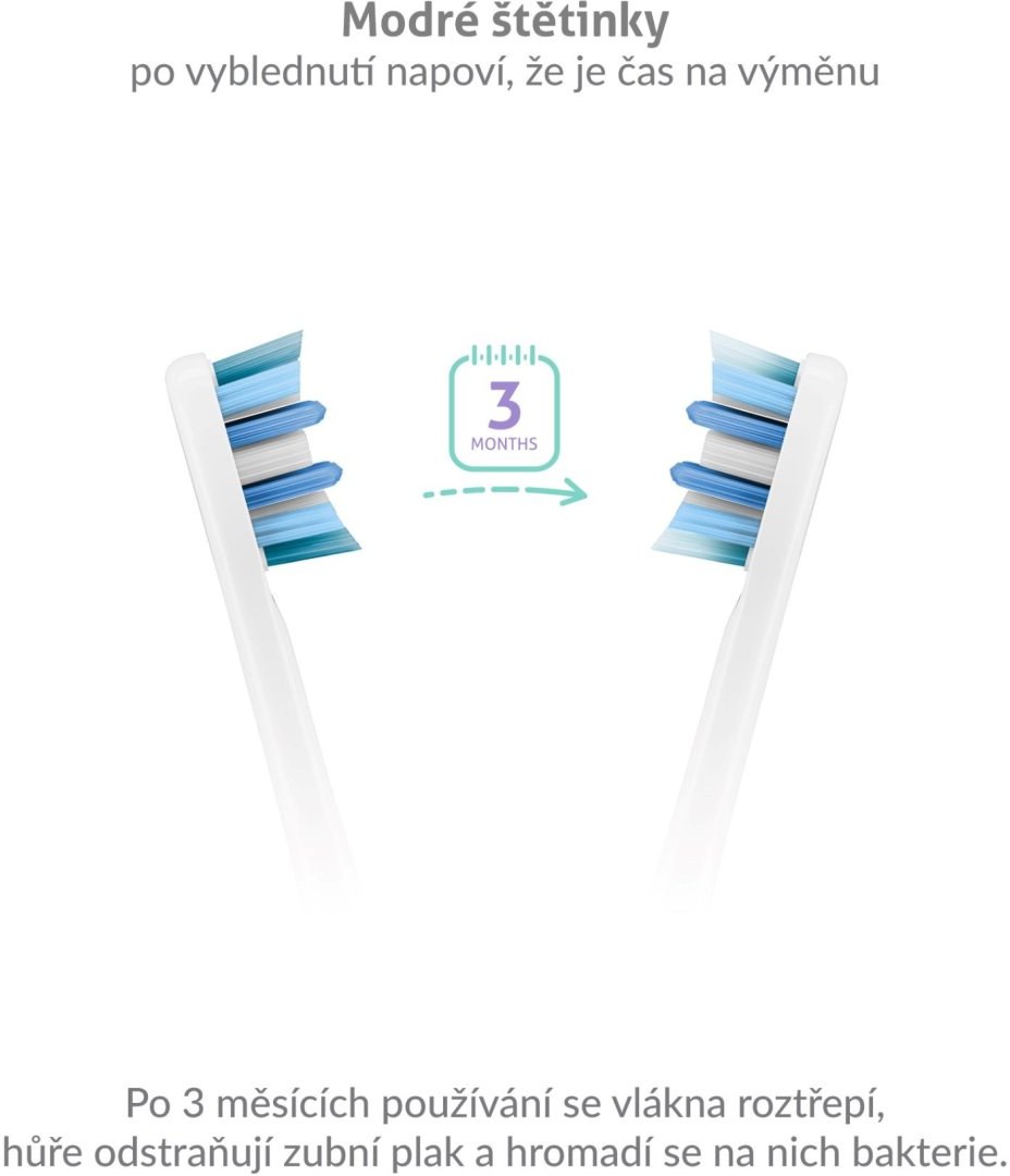 Hlavice vydržia až 3 mesiace používania, potom sa začnú strapkať, strácajú účinnosť a navyše sa na nich hromadia baktérie. Našťastie sú hlavice opatrené modrými štetinami, ktoré po 3 mesiacoch vyblednú a vy tak viete, že je načase hlavice vymeniť.