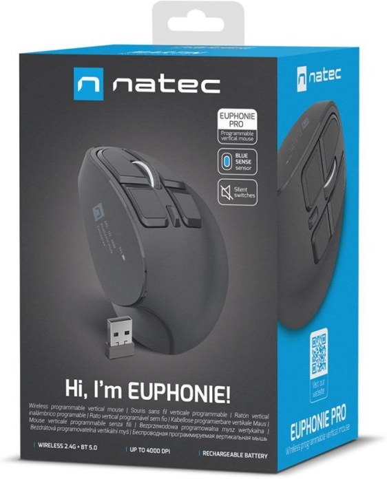 Natec Euphonie Pro je jedna z najmodernejších vertikálnych kancelárskych myší, navrhnutá pre pohodlnú prácu v ergonomických podmienkach. Myš zaručuje nadštandardné bezdrôtové pripojenie, špičkový senzor, širokú škálu funkcií a tvar, ktorý pomáha udržovať zdravie zápästia. Navyše je vybavená tichými spínačmi, ktoré výrazne zvyšujú komfort práce, eliminujú hluk a umožňujú diskrétnejšie používanie zariadenia v kancelárii alebo doma, čo je dôležité najmä pri dlhodobom používaní.Ergonómia pre vaše zdravie