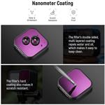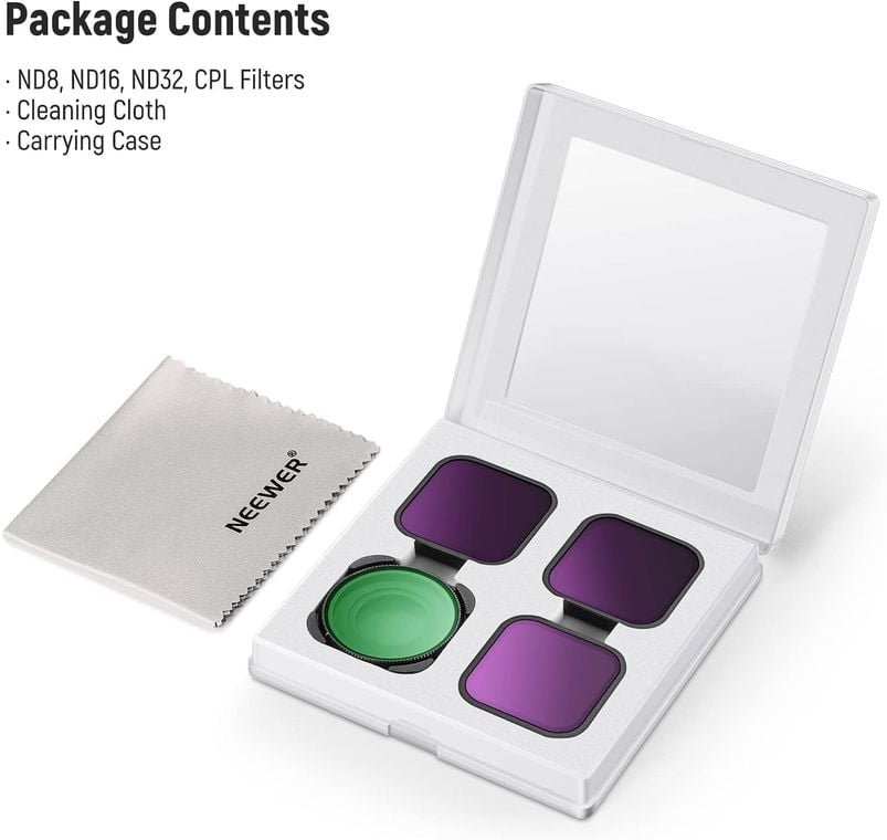 Táto sada 4 80 mm filtrov je špeciálne navrhnutá tak, aby bola kompatibilná s kamerami GoPro Hero 12, Hero 11, Hero 10 a Hero 9 Black. Sada obsahuje filtre CPL, ND8, ND16, ND32 a ochranné puzdro na filtre. Filtre stačí otočiť, aby ste ich nasadili na objektív kamery, a dokonale zapadnú bez rizika poškriabania objektívu. Filtre s neutrálnou hustotou minimalizujú množstvo filtrov vstupujúcich do snímača fotoaparátu, aby sa zabránilo preexponovaniu a spomaleniu rýchlosti uzávierky počas záberov s dlhou expozíciou.ND8 znižuje expozíciu svetla o 3 stupne, ND16 o 4 stupne a ND32 o 5 stupňov. Výberom jednej z nich dosiahnete vyváženú expozíciu v celom zábere v rôznych svetelných podmienkach. Kruhový polarizačný filter (CPL) zvyšuje kontrast a zároveň znižuje odrazy a odlesky. Otočením filtra CPL znížite zbytočné odlesky od reflexných povrchov, ako je voda, sneh a dokonca aj sklenené okná. Filtre na objektívy akčných kamier sú vyrobené z HD optického skla a poskytujú jasný obraz bez farebného odtieňa. Ľahký hliníkový rám pridáva fotoaparátu sotva badateľnú hmotnosť. Tieto filtre sú chránené 28 vrstvami nanopovlakov a sú odolné voči vode, poškriabaniu, oleju a odtlačkom prstov.