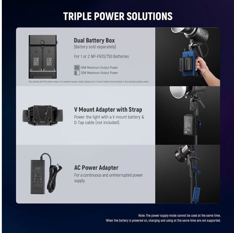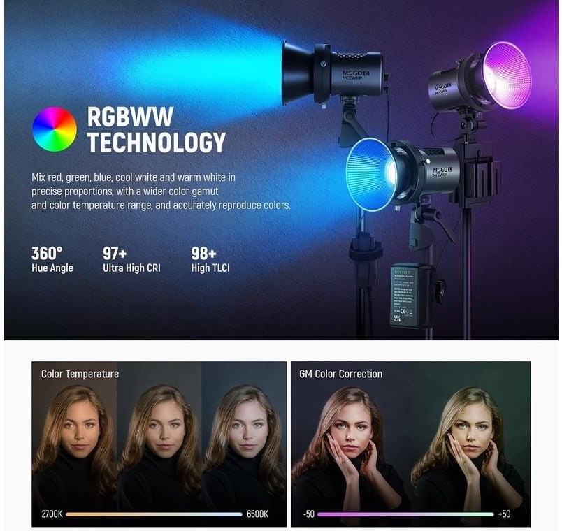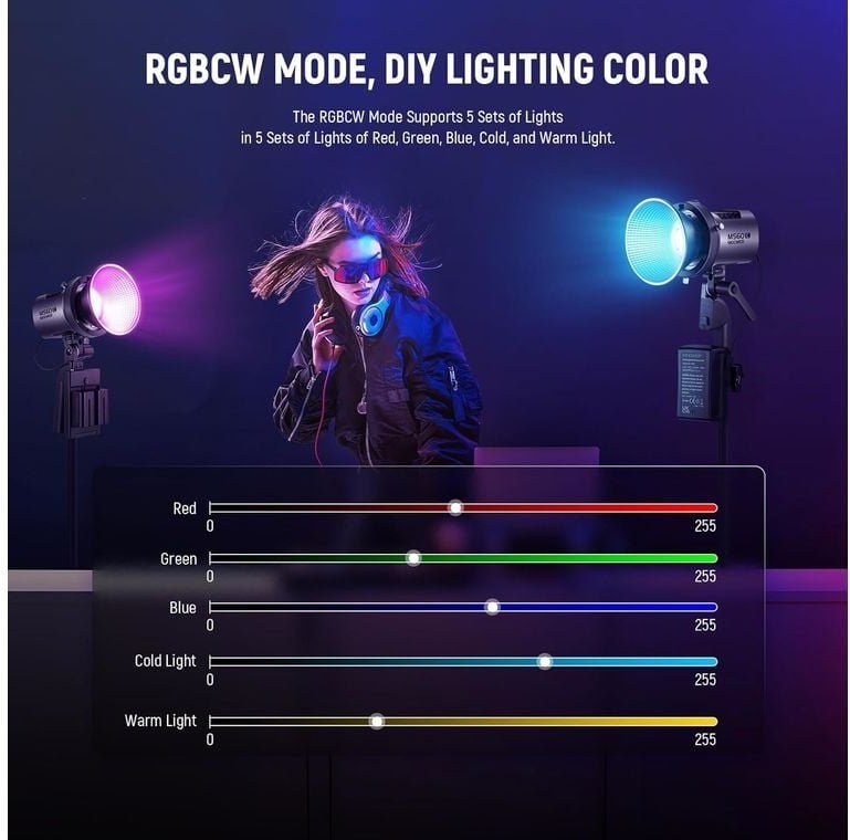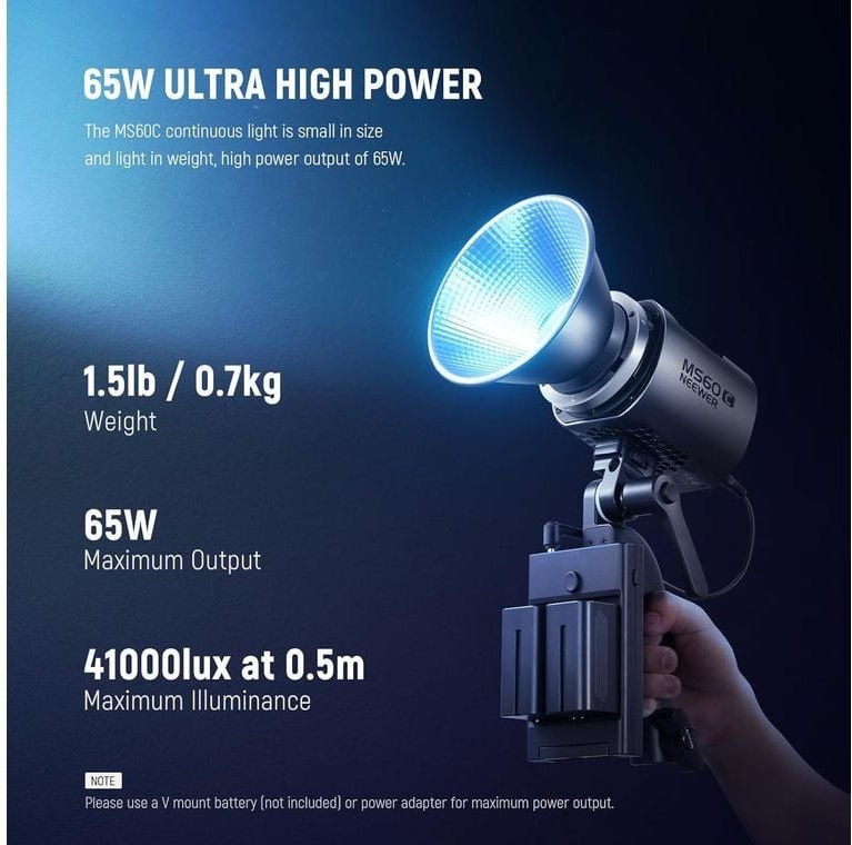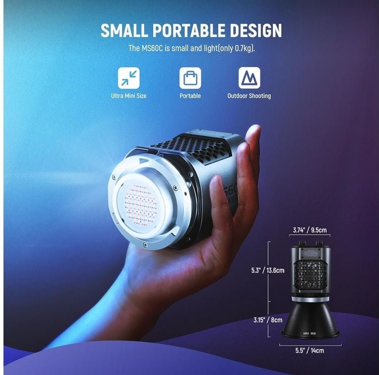Výkonné prenosné fotografické svetlo NEEWER MS60C RGB využíva technológiu miešania svetla RGBWW na lepšie podanie farieb. Má farebnú teplotu 2700K-6500K, vysoký výkon 65 W a svietivosť až 8300 luxov na vzdialenosť 1 metra alebo 41 000 luxov na 0,5 metra. Špičkové špecifikácie CRI97+/TLCI98+ bez blikania zaručujú vernú reprodukciu farieb. Vďaka technológii lineárneho PWM stmievania NEEWER prekonáva minimálnu hranicu jasu od 1 % stredne jasného jasu (jas a výkon sú skutočne na úrovni 1 %) až po 100 % ultra jasného jasu. Svetlo s kovovým hliníkovým puzdrom váži len 700 g pri zachovaní malých rozmerov a je obľúbeným prenosným svetlom na vonkajšie nahrávanie svadobných videí, domáce štúdio, tvorbu obsahu, živé vysielanie a fotografické osvetlenie.Odnímateľná rukoväť sa nakláňa o 180°. Tichý ventilátor predlžuje životnosť svetla a zároveň neruší. Súčasťou je montážny adaptér Bowens pre rôzne modifikátory svetla. Je možné prepínať medzi 4 režimami svetla: CCT, HSI, RGBCW a režim špeciálnych efektov FX. Režim RBGCW podporuje individuálne nastavenia červenej, zelenej, modrej, studenej bielej a teplej bielej na prispôsobenie farieb osvetlenia. Teplota farieb 2700K-6500K s korekciou farieb –50/+50 GM na lepšie napodobnenie prirodzeného svetla, plný uhol tónovania 0–360°, sýtosť 0–100 % a17 predprogramovaných špeciálnych efektov uspokojí všetky vaše potreby pri kreatívnom snímaní videa.