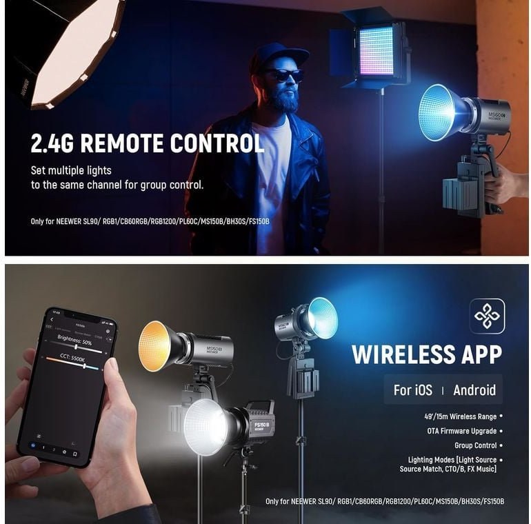 Zariadenie môžete ovládať tromi spôsobmi. Na priame nastavenie použite ovládacie gombíky a funkčné tlačidlá. Nová technológia Infinity umožňuje ovládať stovky svetiel a aktualizovať firmvér OTA prostredníctvom aplikácie NEEWER. Vstavaný systém 2,4Gpodporuje skupinové ovládanie LED svetiel rôznych modelov v kanáloch 00–99 v okruhu 15 m – keď je v rovnakom kanáli nastavených viacero svetiel, ovládanie jedného svetla spôsobí súčasnú zmenu ostatných svetiel.