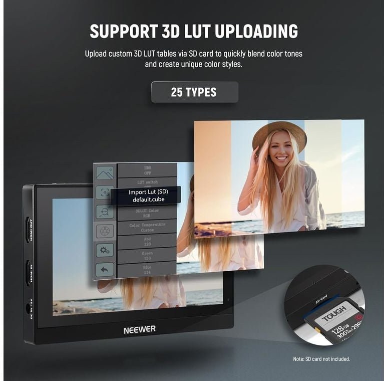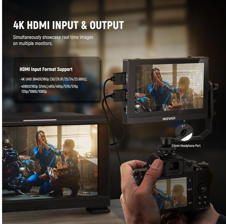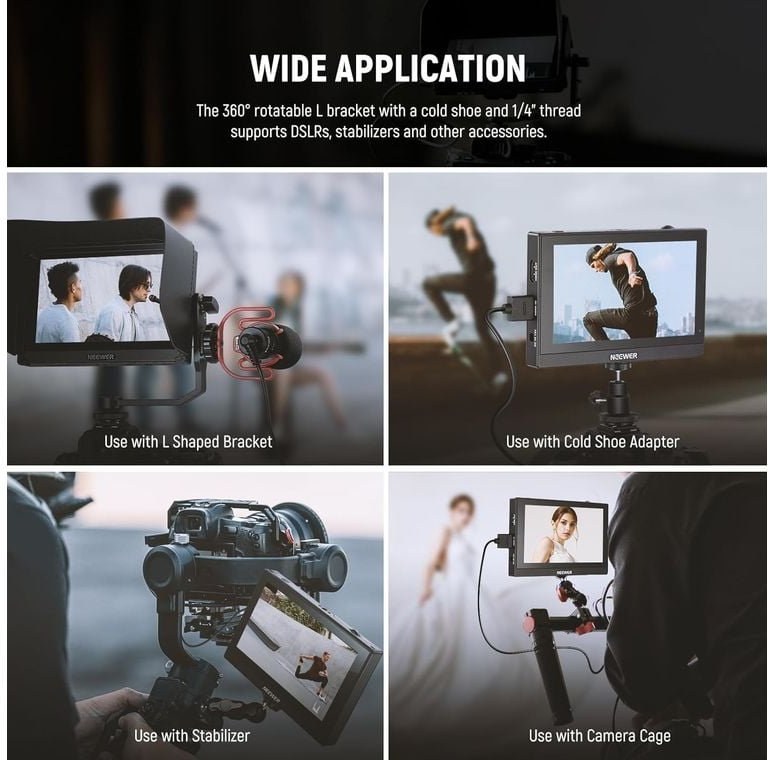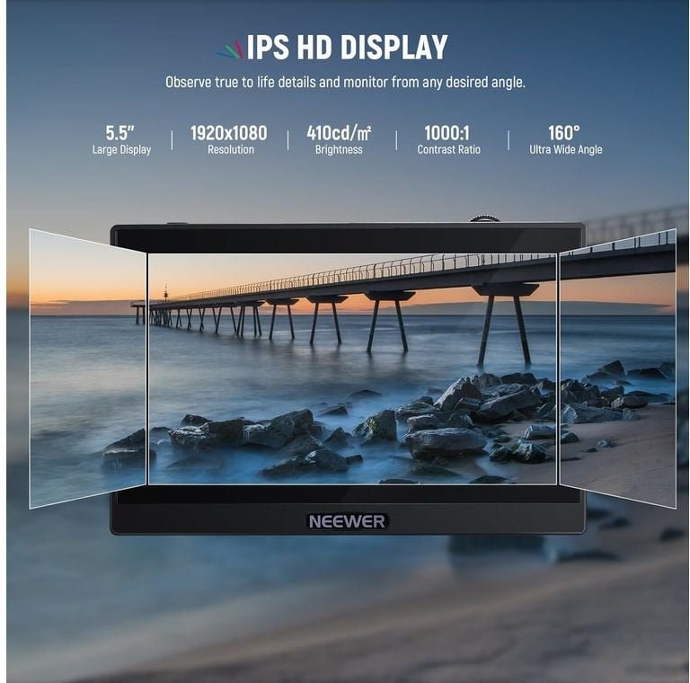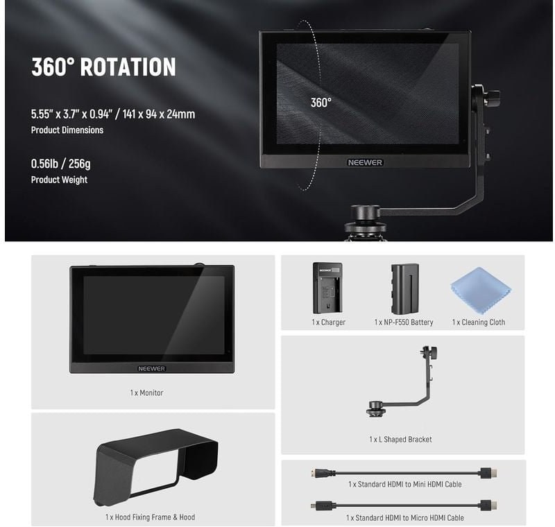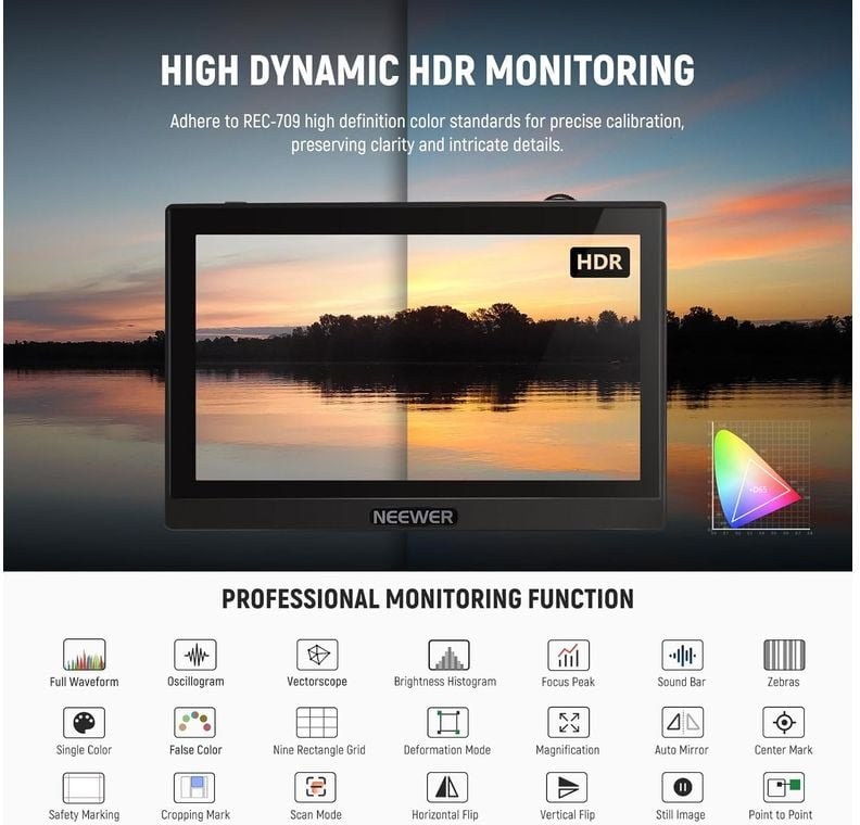 Tento 5,5" profesionálny náhľadový monitor IPS s rozlíšením Full HD je vybavený odolným sklom odolným voči nárazom a umožňuje jednoduché dotykové ovládanie (možno ho vypnúť, aby sa zabránilo náhodným dotykom). K dispozícii je rozlíšenie 1920 × 1080 pixelov, jas 410 nitov, kontrastný pomer 1000:1 a odnímateľná slnečná clona na zníženie oslnenia vo vonkajšom prostredí. Ultraširoký pozorovací uhol 160° zvyšuje jasnosť detailov a držiak v tvare L umožňuje pripevniť rôzne príslušenstvo, digitálne zrkadlovky alebo stabilizátory. Je vybavený funkciou 3D LUT, ktorá poskytuje vysoko dynamický výstup HDR bez farebného odliatia. Obsahuje aj predinštalované tabuľky 3D LUT pre jednoduché používanie a podporuje nahrávanie až 25 vlastných tabuliek 3D LUT prostredníctvom karty SD (nie je súčasťou balenia).Vychutnajte si sledovanie videa v reálnom čase bez zníženia kvality obrazu a zdieľajte živé zobrazenia na väčších monitoroch alebo projektoroch bez oneskorenia. To z neho robí ideálny nástroj pre režisérov, fotografov a iných „vizuálnych kapitánov“. Podporuje vstup HDMI 4K UHD, ako aj súčasné monitorovanie zvuku prostredníctvom 3,5 mm konektora pre slúchadlá (slúchadlá nie sú súčasťou dodávky). Model F500 podporuje funkcie Full Waveform, Oscillogram (RGB/YUV/Y), Vectorscope, Brightness Histogram, Peak Focus (1–10, Red/Green/Blue/White/Yellow), Sound Stripe, Zebra, One Color, False Color, Nine Grids, Warp Mode, Zoom, Auto Mirroring, Point to Point, Center Mark, Safety Mark, Crop Mark a ďalšie.