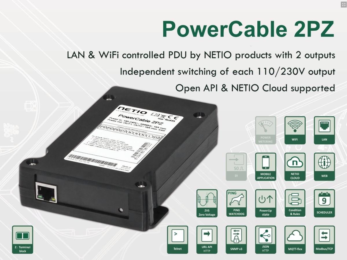 NETIO PowerCable 2PZ je ploché PDU (Power Distribution Unit) s LAN pripojením pomocou RJ45 (Ethernet) alebo WiFi (2,4 GHz – interná anténa). Výstupy je možné jednotlivo zapnúť/vypnúť (reštartovať) na webe zariadenia, v mobilnej aplikácii alebo na webe služby NETIO Cloud.