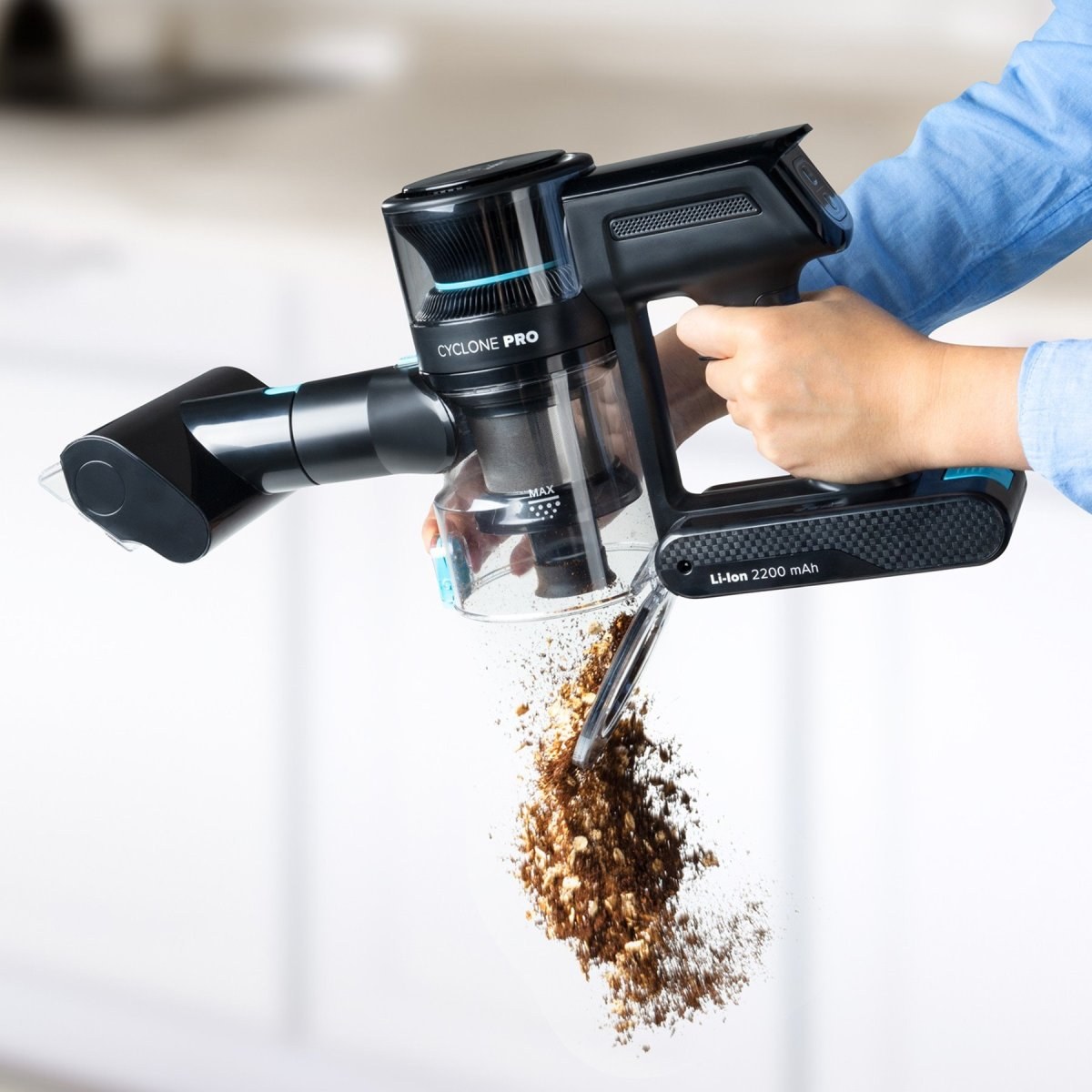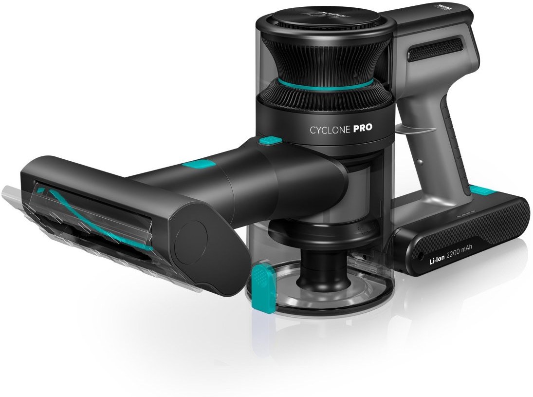 Zariadenie má dizajn 2 v 1. Funguje ako tyčový vysávač, ktorý použijete na vysávanie väčších plôch. Avšak ľahko ho premeníte na praktický ručný vysávač. S jeho pomocou očistíte ťažko prístupné miesta alebo odstránite omrvinky z nábytku či sedačiek v aute. Vďaka nízkej hmotnosti a ergonomickej rukoväti s ním pohodlne manipulujete a ľahko ho prenášate.Technológia Cyclone PRO