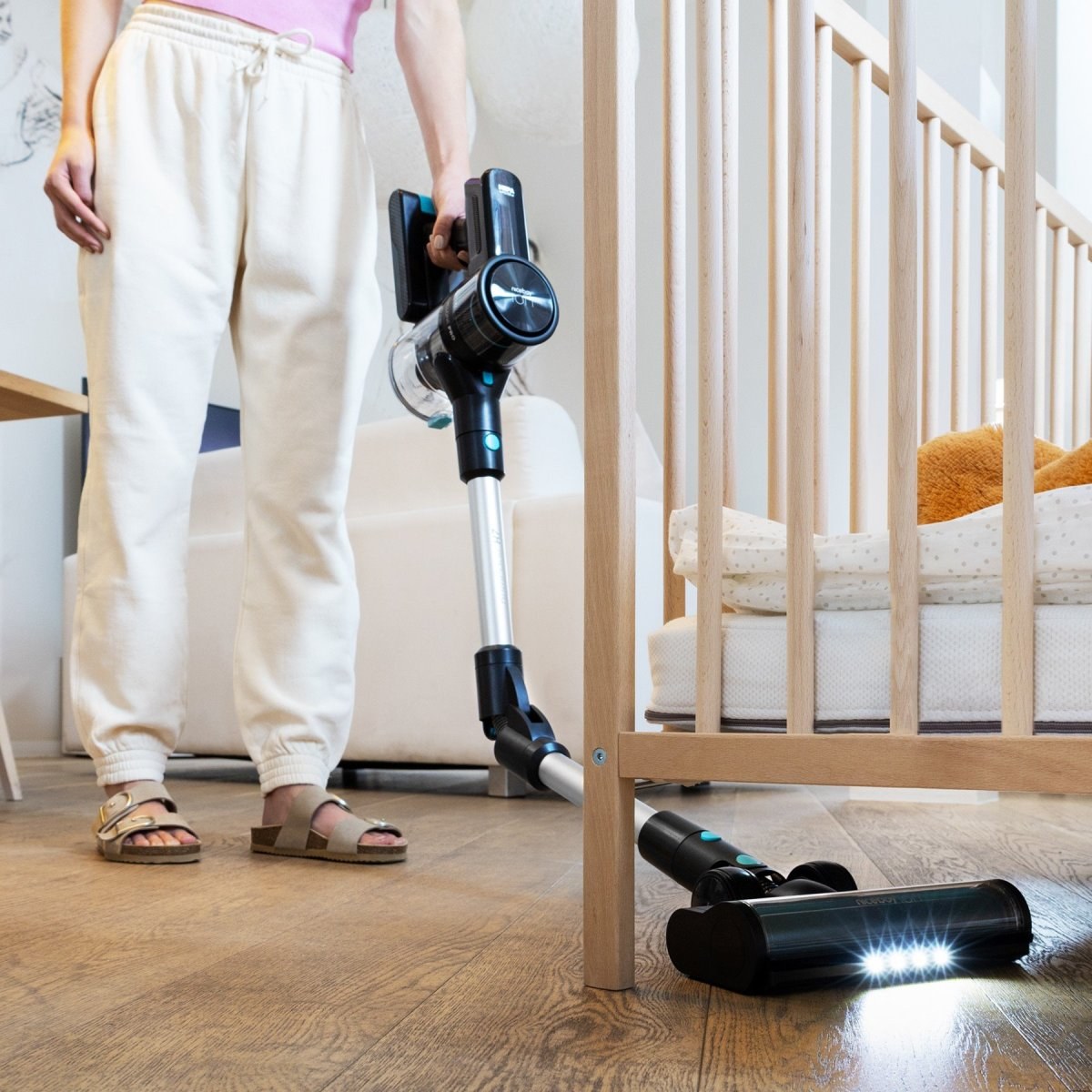 Súčasťou vysávača je bohatá sada nástavcov. Pomocou predlžovacieho nástavca s kĺbom sa dostanete aj na ťažko dosiahnuteľné miesta vo vašej domácnosti. Šterbinová hubica si poradí s úzkymi medzerami medzi nábytkom. S kefou dôkladne očistíte rôzne povrchy, podlahy a koberce. Po nasadení flexibilnej hubice vysajete aj oblasti v miestnosti, kam by ste sa s bežným nástavcom nedostali. V balení nájdete aj hlavicu 2v1 a hlavicu na sedačky a textílie. S vysávačom teda upratujete každý kút svojho domova.Dlhá výdrž batérie a LED osvetlenie
