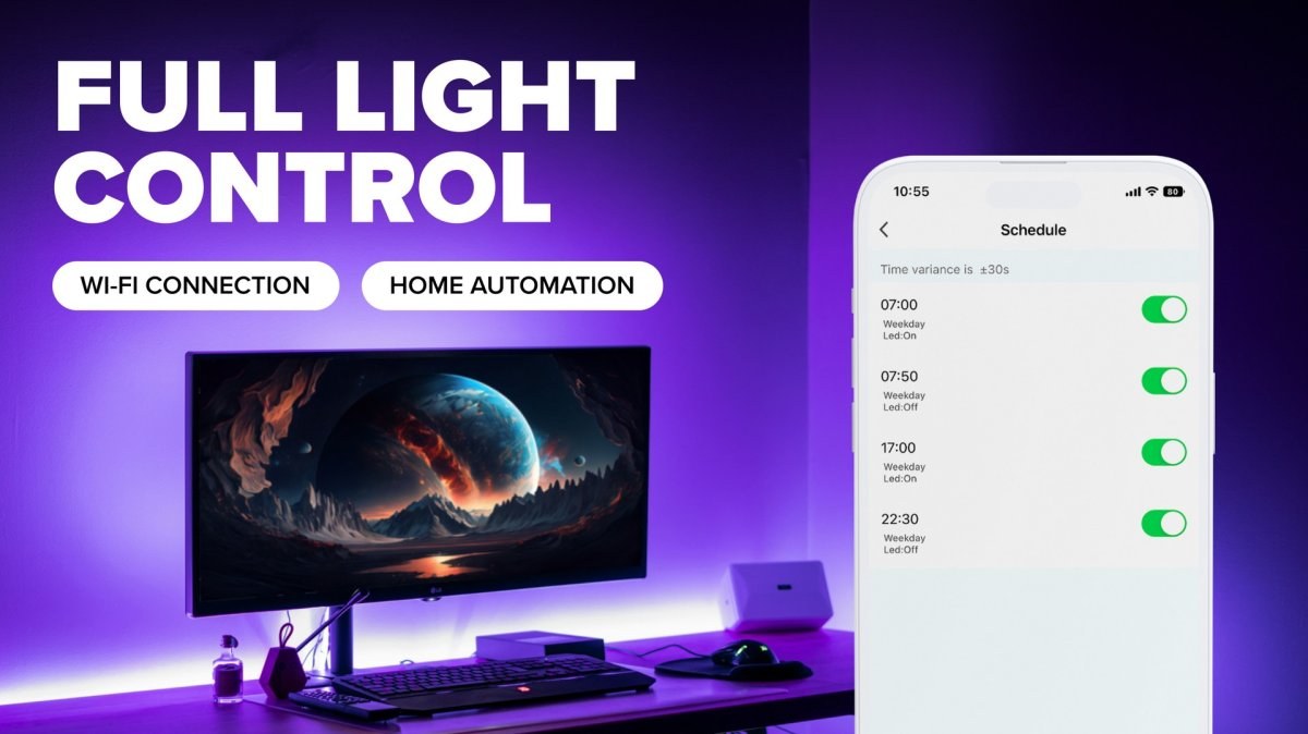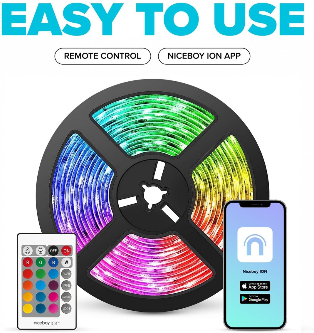 Niceboy ION SmartStrip RGB LED pásik pridáva do interiéru štýl a funkčnosť. Jeho inteligentné funkcie umožňujú vytvárať dokonalú atmosféru, zatiaľ čo energetická efektívnosť prispieva k úsporám. Ovládanie je možné prostredníctvom mobilnej aplikácie Niceboy ION, diaľkového ovládača, alebo hlasom cez Google Assistant. Aplikácia ponúka možnosť nastavenia automatizovaných scenárov a časovačov pre zapnutie či vypnutie. Personalizácia osvetlenia je jednoduchá vďaka širokej škále 16 miliónov farieb, nastaviteľnému jasu, sýtosti a teplote svetla.Štýlové osvetlenie