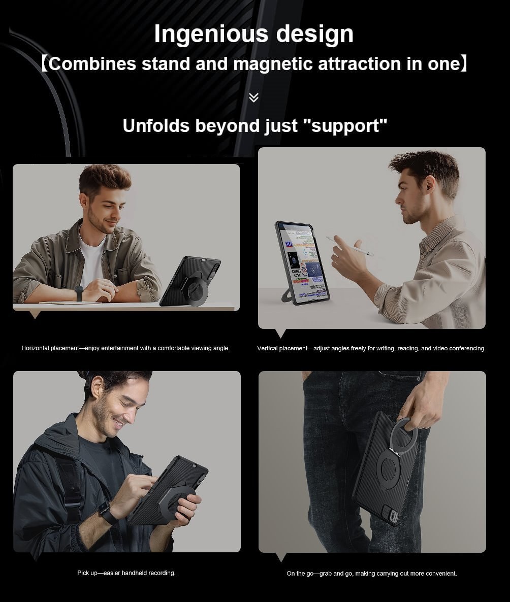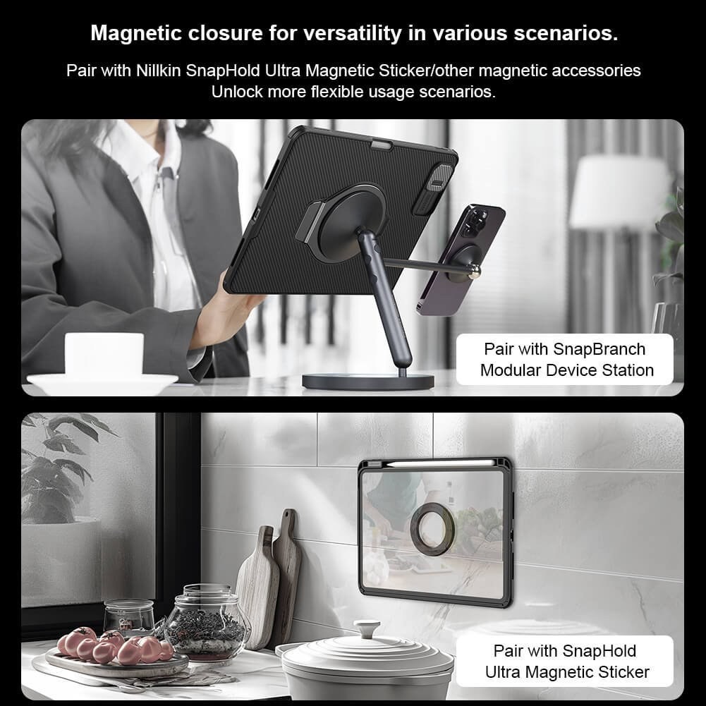 CamShield Pad zadný kryt je multifunkčný kryt navrhnutý pre tablety, ktorý spája štýl, ochranu a praktické funkcie do jedného. Kryt je vyrobený z kombinácie odolných materiálov TPU a PC, ktoré zaisťujú vynikajúcu ochranu proti pádu, poškriabaniu, nárazom i ohýbaniu. Má aj posuvný kryt fotoaparátu, ktorý vám ochráni šošovky pred poškriabaním a nežiaducim prachom. Výklopný stojan vám umožní pohodlné sledovanie obrazovky pod rôznymi uhlami, čo oceníte pri práci, zábave alebo videohovoroch. Vďaka magnetickej funkcii je možné ľahko pripevniť k ďalším magnetickým povrchom alebo príslušenstvu, čo prináša maximálnu flexibilitu pri používaní. Kryt má tiež vyhradený slot na stylus, ktorý vám zaistí, že ho budete mať vždy po ruke a môžete okamžite zaznamenať každý moment inšpirácie. Detaily ako mierne zvýšené okraje proti poškriabaniu displeja, postranné protišmykové pruhy pre lepší úchop a citlivé, presné tlačidlá robia z tohto krytu ideálnu ochranu pre váš tablet, pripravenú zvládnuť každú situáciu.Vlastnosti