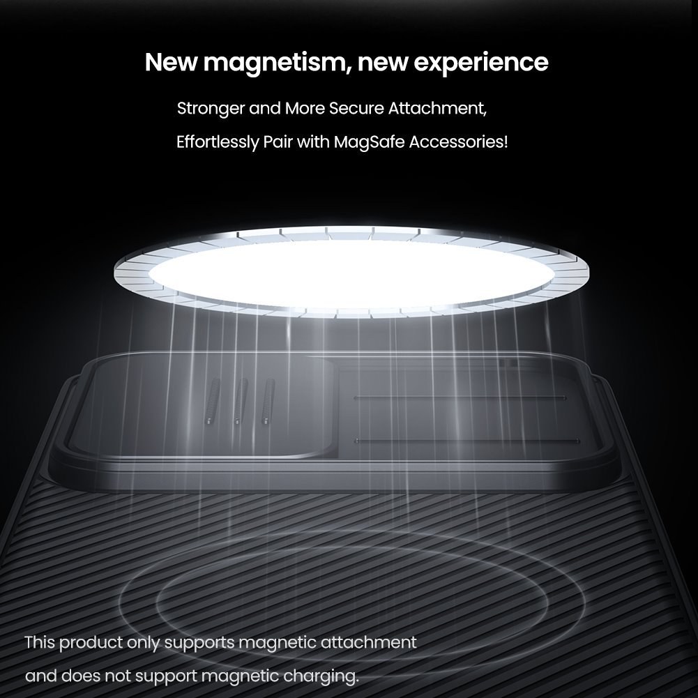 Nillkin CamShield PRO Magnetic je unikátny kryt s posuvným krytom šošovky fotoaparátu a integrovaným magnetom. Oproti klasickému CamShield je unikátny v tom, že sa skladá z dvoch materiálov a je vybavený magnetom. Chrbát krytu je vyrobený z pevného a odolného plastu a to vrátane krytu fotoaparátu. Rámček krytu je vyrobený z mäkčeného TPU plastu, pre najlepšiu ochranu okrajov a rohov telefónu. Oba dva materiály sú vysoko odolné proti opotrebovaniu, ale aj proti odtlačkom prstov a mastnote. Presné výrezy na ovládacie prvky a potrebné konektory zaisťujú pohodlnú obsluhu telefónu.Vlastnosti