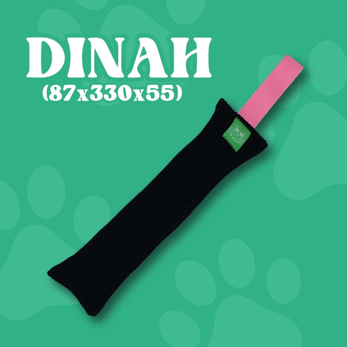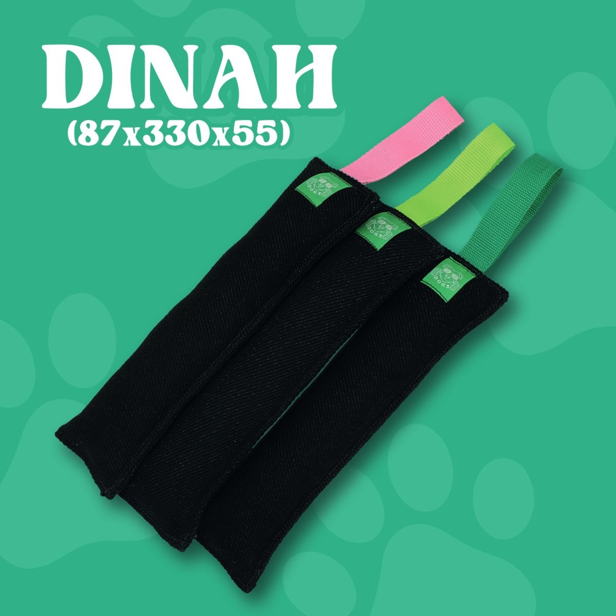 DINAH z kolekcie 2024 je veľké kusadlo z ponuky OG Sporting Dogs. Vyrobené z kvalitnej ringo tkaniny, jeho vnútro je naplnené textilnou drťou a rúčka je zhotovená z syntetického materiálu, všetko spojené kvalitným šitím syntetickou niťou pre maximálnu pevnosť. Tento model je ideálny na tréning napríklad skokových disciplín v Bull športoch alebo pri výcviku služobnej kynológie pre stredné veľké a veľké psy. K dispozícii je v troch farebných variantoch: čierna s rúčkou vo farbách zelenej, svetlozelenej a ružovej. Jeho tuhosť je označená stupňom 3, čo znamená, že je vhodnejší pre dospelých psov s pevným skusom.