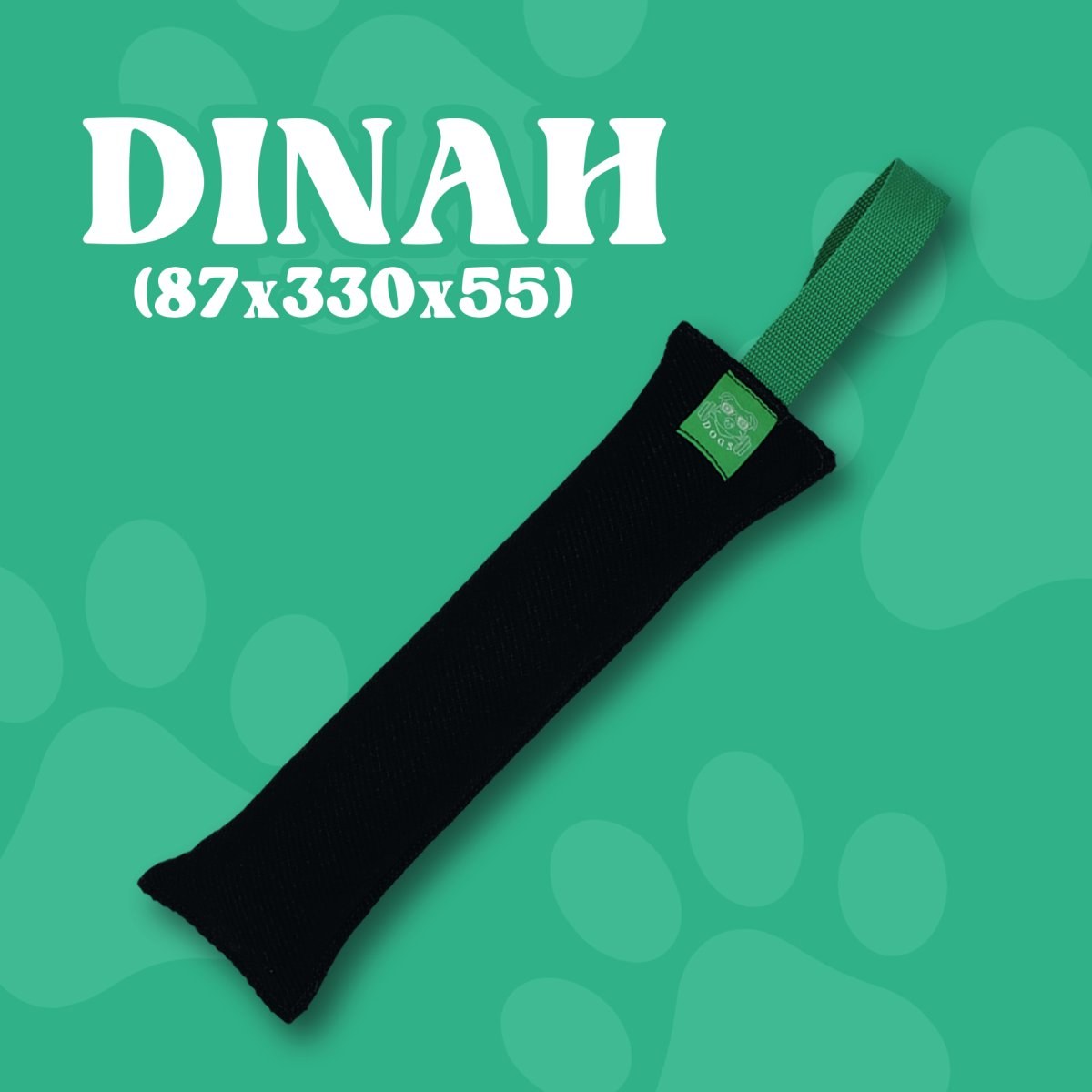 DINAH z kolekcie 2024 je veľké kusadlo z ponuky OG Sporting Dogs. Vyrobené z kvalitnej ringo tkaniny, jeho vnútro je naplnené textilnou drťou a rúčka je zhotovená z syntetického materiálu, všetko spojené kvalitným šitím syntetickou niťou pre maximálnu pevnosť. Tento model je ideálny na tréning napríklad skokových disciplín v Bull športoch alebo pri výcviku služobnej kynológie pre stredné veľké a veľké psy. K dispozícii je v troch farebných variantoch: čierna s rúčkou vo farbách zelenej, svetlozelenej a ružovej. Jeho tuhosť je označená stupňom 3, čo znamená, že je vhodnejší pre dospelých psov s pevným skusom.