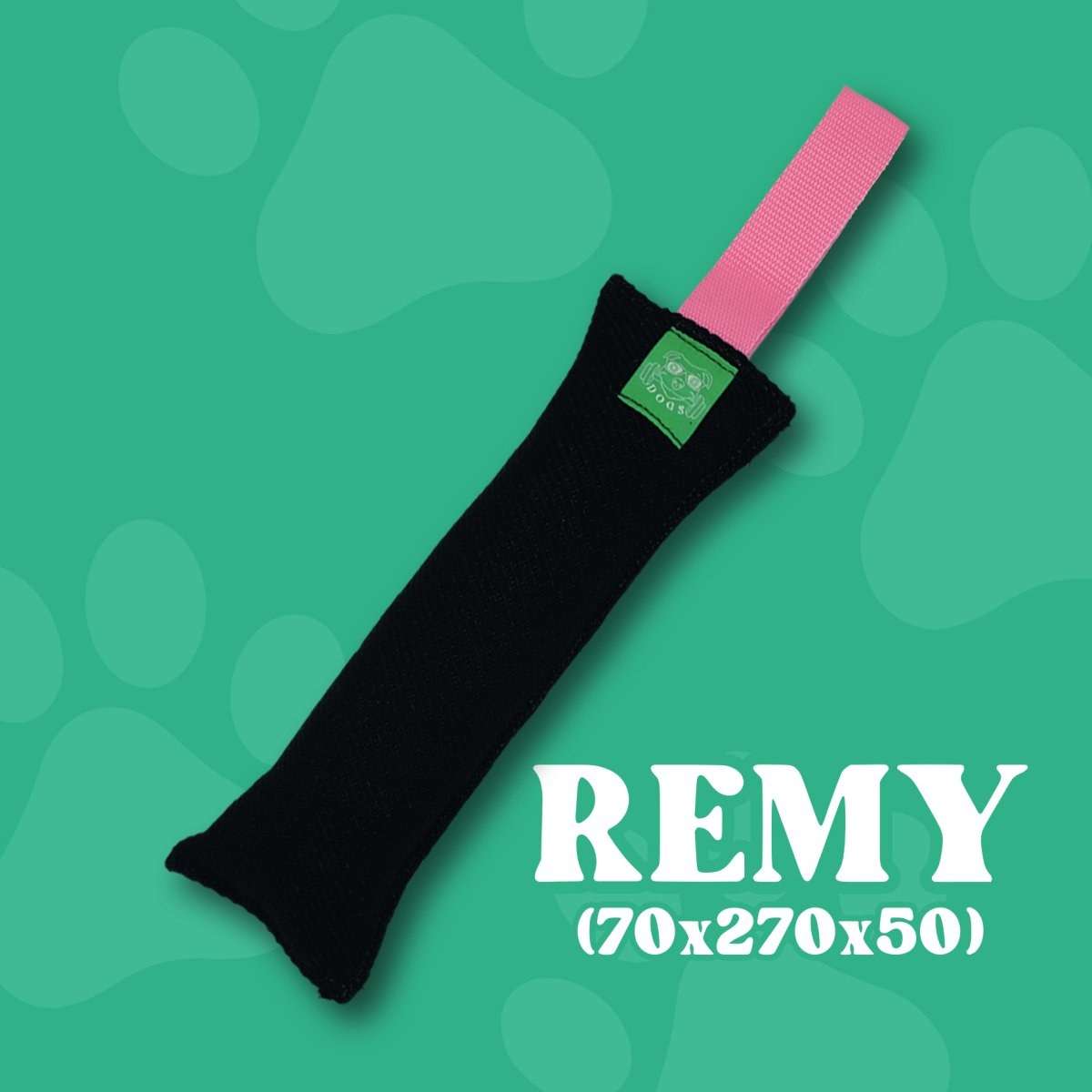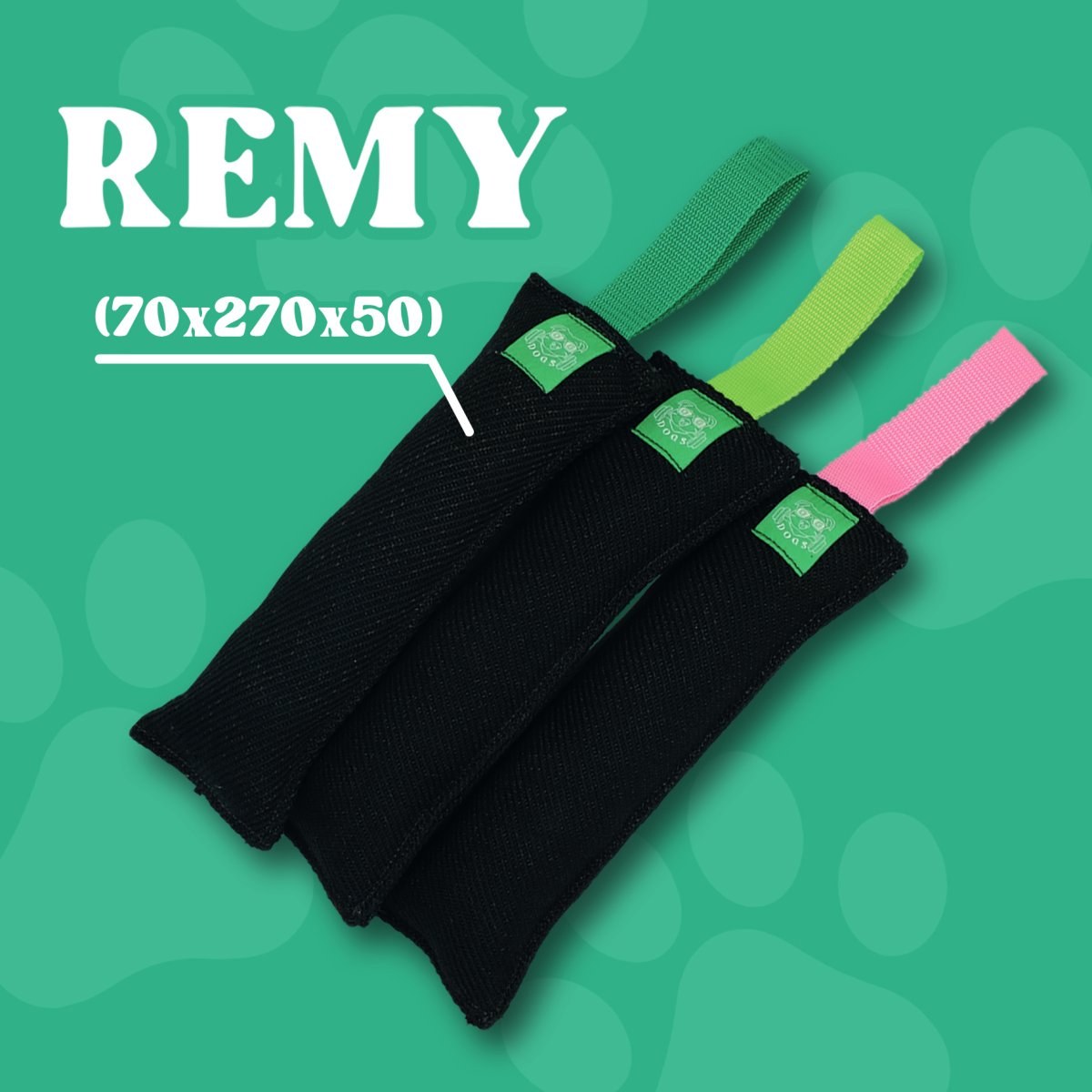 REMY z kolekcie 2024 predstavuje stredne veľké kusadlo z ponuky OG Sporting Dogs. Je vyrobené z kvalitnej ringo tkaniny, pričom jeho vnútro je naplnené textilnou drťou. Rukoväť je zhotovená zo syntetického materiálu a všetko je spojené kvalitným šitím syntetickou niťou pre maximálnu pevnosť. Tento model je ideálny na tréning vo väčšine disciplín bull športov alebo ako preťahovadlo pre stredne veľké a veľké psy. K dispozícii je v troch farebných variantoch: čierna s rukoväťou vo farbách zelenej, svetlozelenej a ružovej. Jeho tuhosť je označená stupňom 3, čo znamená, že je vhodnejší pre dospelých psov s pevným skusom.