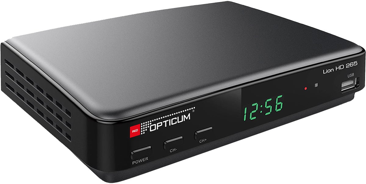 Opticum LION HD 265 DVB-T2 je FULL HD digitálny terestriálny prijímač pre príjem DVB-T/T2 vysielanie s podporou najnovšieho kodeku H.265 HEVC.Na prednom paneli prijímača nájdete 4-miestny LED display , ktorý zobrazuje aktuálny sledovaný program či menu prijímača. K #CRLF # dispozícii sú 3 základné ovládacie tlačidlá , s ktorých pomocou prijímač zapnete a vypnete, alebo prepnete na iný kanál.