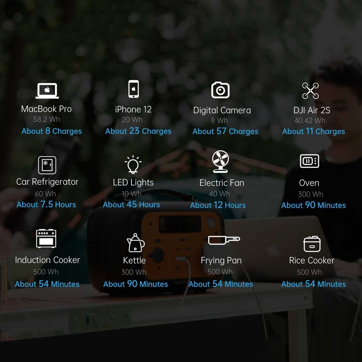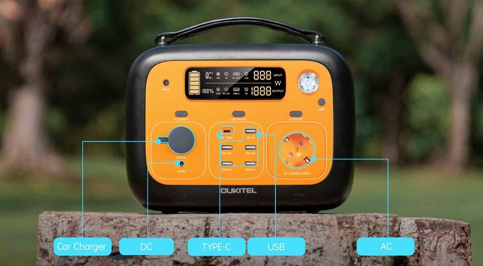 Oukitel P501 je prenosný napájací zdroj ideálny do chatky alebo napríklad na kempovanie. Táto elektrocentrála má výkon 500 wattov (max. 1000 W v okamžitej prevádzke) a kapacitu 505 Wh. Má 9 nabíjacích portov, LCD displej a LED svetlo pre jednoduché použitie v zlých svetelných podmienkach. Táto kompaktná elektráreň sa ľahko a efektívne prenáša vďaka elastickej rukoväti.