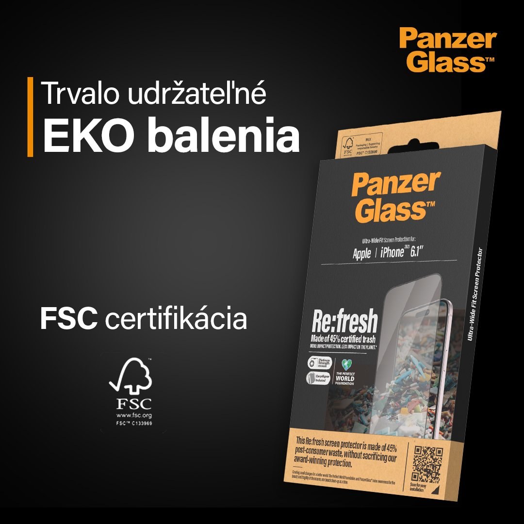 Odolná ekologická ochrana displejaKeď nosíte svoje zariadenie vo vrecku spolu s kľúčmi alebo inými ostrými predmetmi, displej sa môže ľahko poškriabať. Riziko tiež predstavujú silné nárazy či pády. PanzerGlass™ prišiel s ekologickým riešením v podobe ochranného skla Re:fresh.