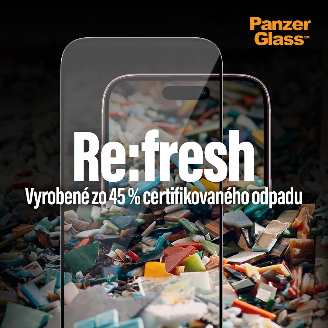 sklo Re:fresh je vyrobené zo 45 % post-spotrebiteľského odpadu bez straty cennej kvality ochrany displeja. Ide o bežný výrobný odpad (napr. odrezky z výroby papiera, chybné hliníkové plechovky a pod.