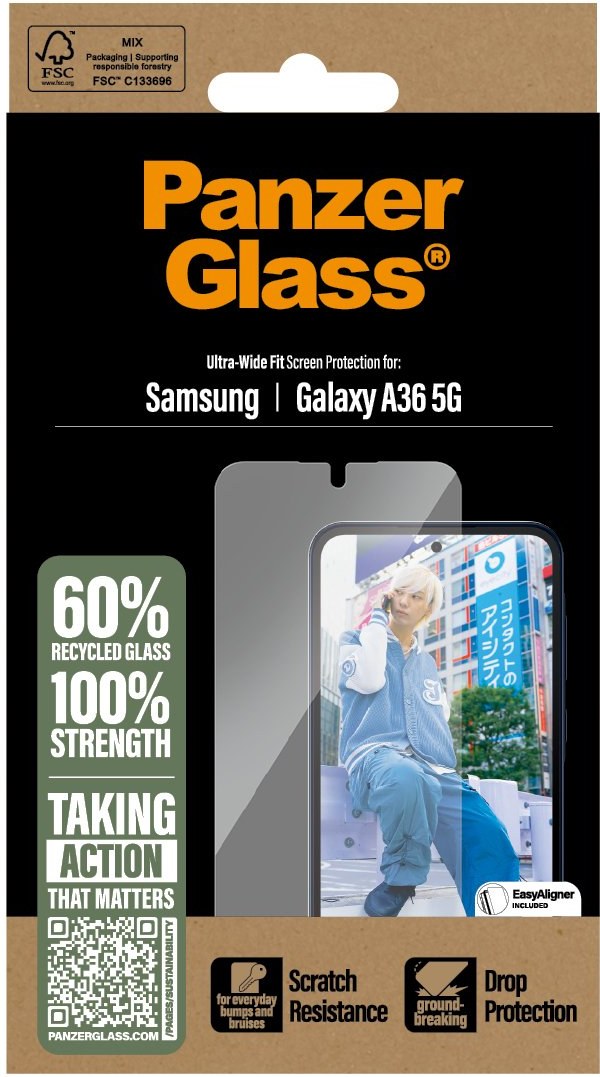 V balení každého ochranného skla PanzerGlass™ pre Samsung Galaxy A36 nájdete praktický rámik EasyAligner, ktorý je vyrobený zo 100 % recyklovaného plastu. Práve vďaka nemu aplikujete sklo presne na stred displeja hneď na prvýkrát, aj keď ste to nikdy predtým nerobili.