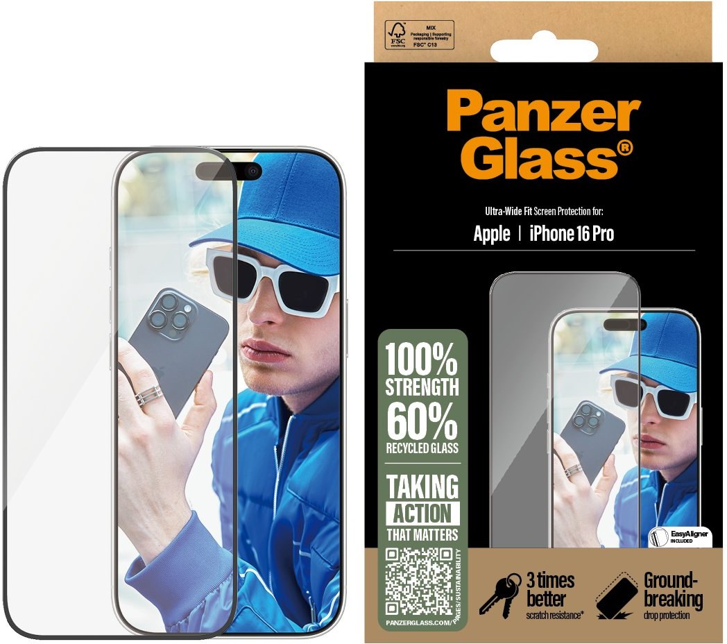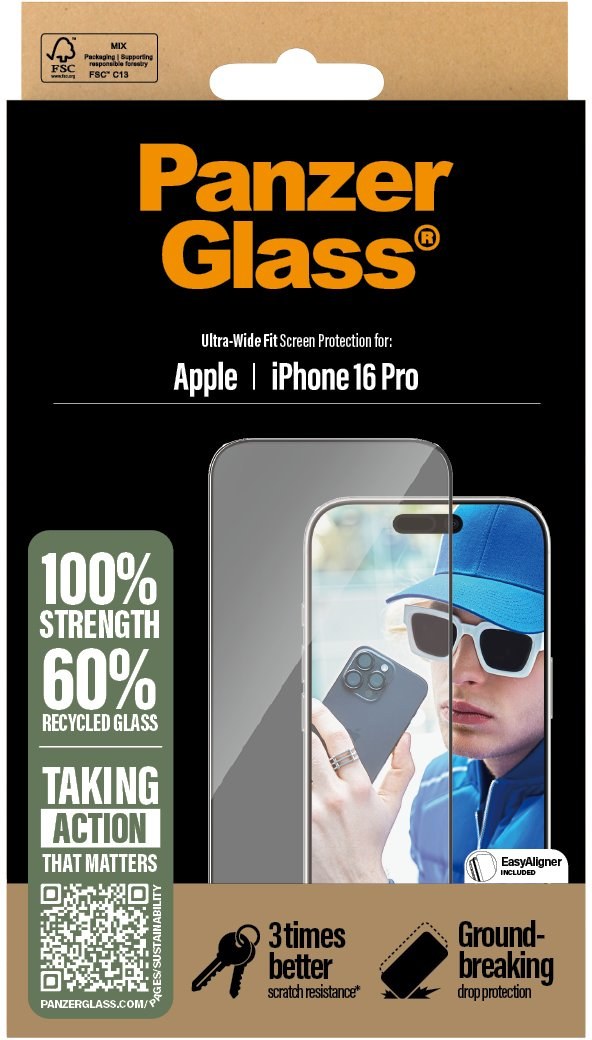 V roku 2024 spoločnosť PanzerGlass™ znížila množstvo papiera používaného na výrobu obalov priemerne o 66 %. A rovnako ako všetky ostatné produkty tohto dánskeho výrobcu, aj sklá pre iPhone 16 Pro sa dodávajú v krabičke vyrobenej z recyklovateľného papiera s certifikátom FSC™.