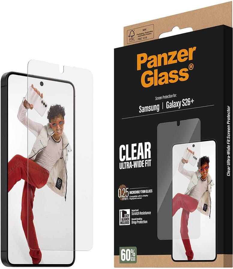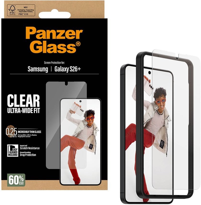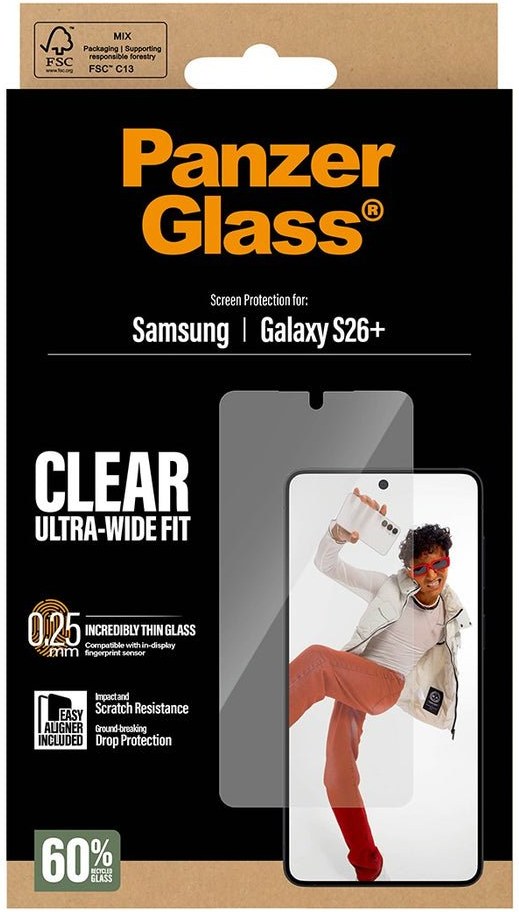 Sklo PanzerGlass™ pre Samsung Galaxy S26+ má precízne navrhnutú veľkosť Ultra-Wide Fit, vďaka ktorej dokonale prekrýva celú prednú stranu zariadenia až po okraj. Zároveň však necháva malý priestor na hranách, takže je plne kompatibilné s puzdrami a obalmi.