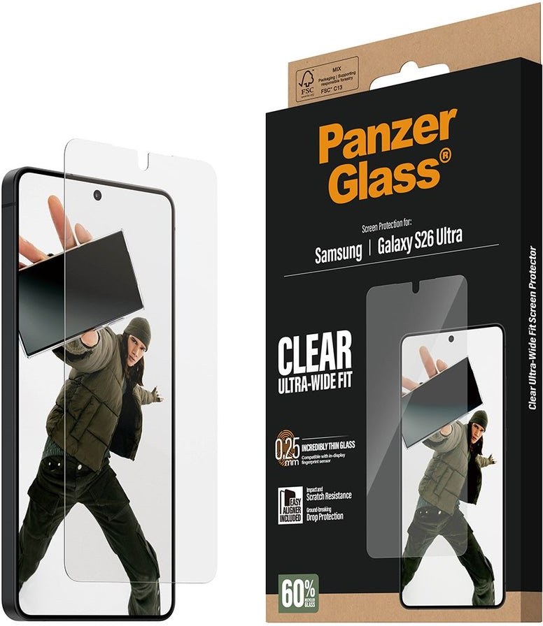 Sklo PanzerGlass™ pre Samsung Galaxy S26 Ultra má precízne navrhnutú veľkosť Ultra-Wide Fit, vďaka ktorej dokonale prekrýva celú prednú stranu zariadenia až po okraj. Zároveň však necháva malý priestor na hranách, takže je plne kompatibilné s puzdrami a obalmi.