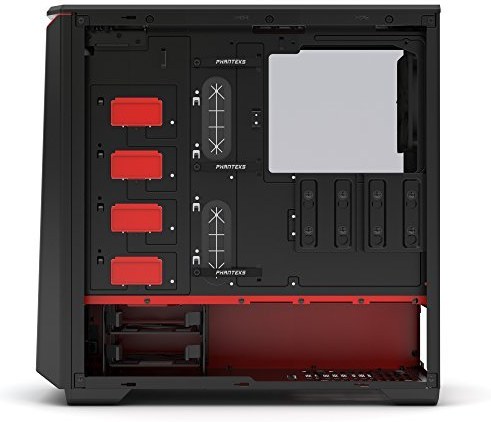 čierna skrinka Midi Tower s červenými prvkami a temperovaným bočným sklom
