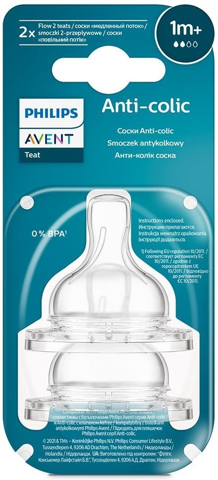 Cumlíky Anti-colic sú dostupné v rôznych prietokoch, aby sa prispôsobili vývoju a potrebám dieťaťa v rôznych fázach rastu. Odporúča sa meniť cumlíky každé tri mesiace z hygienických dôvodov. Dôležité je používať tieto cumlíky výhradne s fľašami Philips Avent Anti-colic, aby bol zabezpečený správny účinok ventilu.