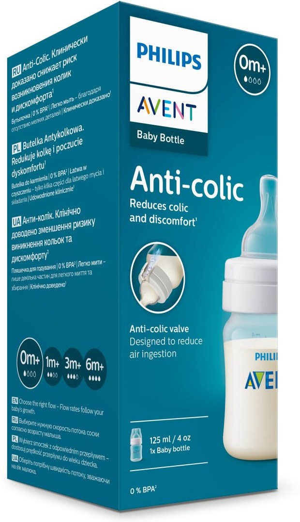 Jedinečný ventil Anti-colic od Philips Avent je klinicky overený a navrhnutý na zmiernenie prehĺtania vzduchu, čím pomáha znižovať koliku a plynatosť. Klinické štúdie ukázali, že fľaša Philips Avent znižuje výskyt koliky a nervozity. Deti kŕmené fľašami Philips Avent so systémom potláčajúcim koliku sú v noci o 60 % menej nervózne než deti kŕmené konkurenčnými fľašami s podobným systémom.