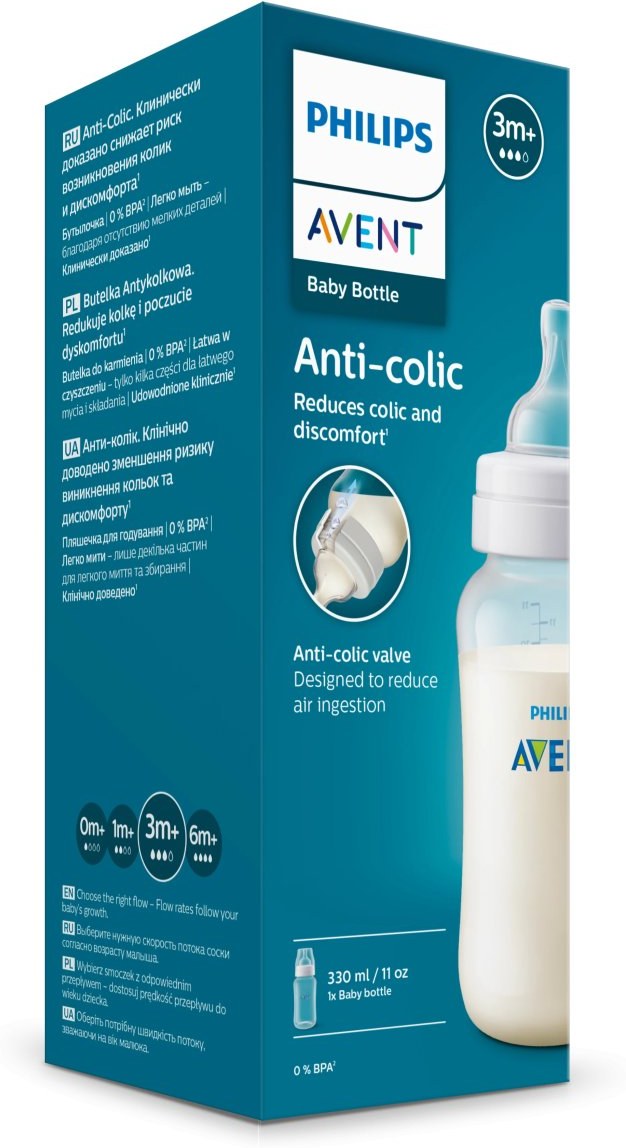 Fľaša Philips Avent Anti-colic je vyrobená z polypropylénu bez obsahu BPA. Cumlíky sú dostupné s rôznymi prietokmi, ktoré sa prispôsobujú rastu dieťaťa. Z hygienických dôvodov sa odporúča ich výmena každé 3 mesiace. Fľaša je plne kompatibilná s radom Anti-colic, vrátane verzie s ventilačným otvorom AirFree, a možno ju kombinovať s odsávačkou mlieka, fľašou a dielmi pohára podľa aktuálnych potrieb.