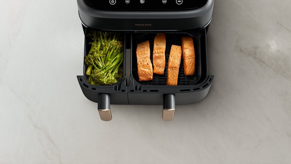 Teplovzdušná fritéza Philips série 3000 s dvojitým košom načasuje prípravu dvoch jedál tak, aby boli teplé a pripravené v rovnakom čase. Vychutnajte si chutné a zdravé varenie s veľkou zásuvkou na hlavné jedlá pre celú rodinu a menšou zásuvkou na prípravu príloh alebo jedál pre jednu osobu