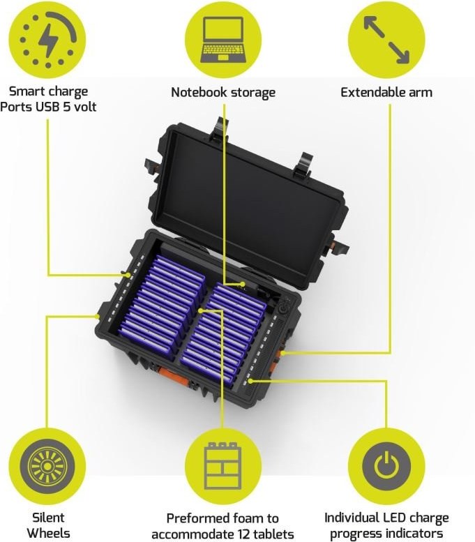 Najefektívnejšie riešenie na nabíjanie 20 tabletov a 1 notebooku počas prepravy. Originálny bezpečnostný kufor s funkciou dobíjania.Technické parametre