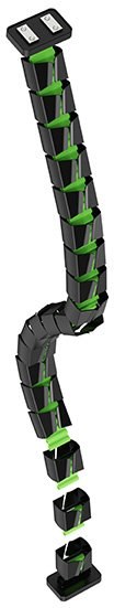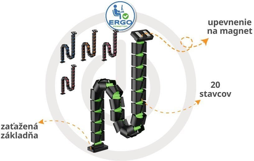 Organizér Powerton WPECM využíva unikátnu štruktúru inšpirovanú chrbticou, ktorá sa prirodzene naťahuje aj smršťuje. To znamená, že sa bez problémov prispôsobí pohybu výškovo nastaviteľného stola bez toho, aby došlo k prepätiu alebo poškodeniu káblov. S každým zdvihom stola sa pohybuje organizátor plynule s ním – akoby bol jeho súčasťou. Zabezpečuje tak, že káble ostávajú vždy chránené a zároveň neobmedzujú ergonomické nastavenie pracovnej výšky. To je šikovný detail, ktorý ocení každý, kto mení pozíciu stola počas dňa.Modulárny systém