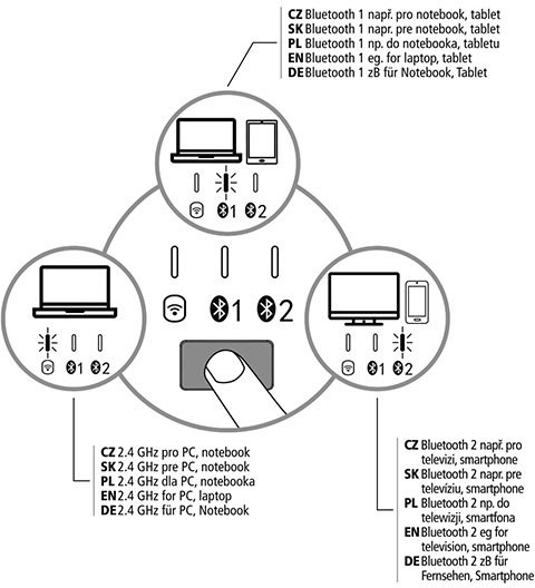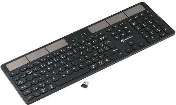Bezdrôtová klávesnica, ktorú môžete spárovať až s tromi rôznymi zariadeniami súčasne vďaka 2,4 GHz bezdrôtovému prijímaču a dvom na sebe nezávislými Bluetooth kanálmi! Prepínajte sa ľahko medzi pripojenými zariadeniami iba stlačením klávesy. Vďaka super tenkému modernému designu klávesnica skvelo vypadá a písanie na nej si ihneď zamilujete vďaka veľmi nízkemu profilu kláves evokuje písanie na notebooku. Zabudovanú batériu navyše nemusíte vôbec nabíjať, solárny panel sa o neustále nabitie postará. Stačí mať klávesnicu položenú na dobre osvetlenom mieste (slnečné svetlo alebo dobre osvetlená miestnosť). Skvelým pomocníkom pre predĺženú životnosť batérie je iste aj uspávací mód.Spárovanie až s tromi zariadeniami