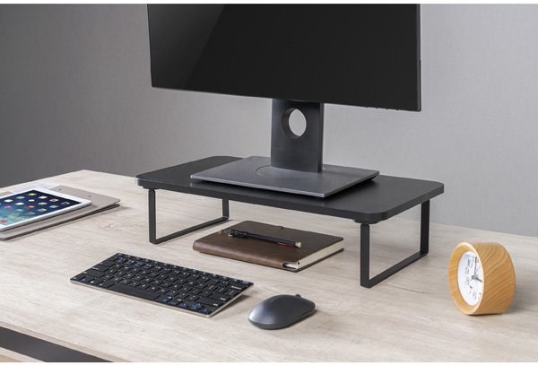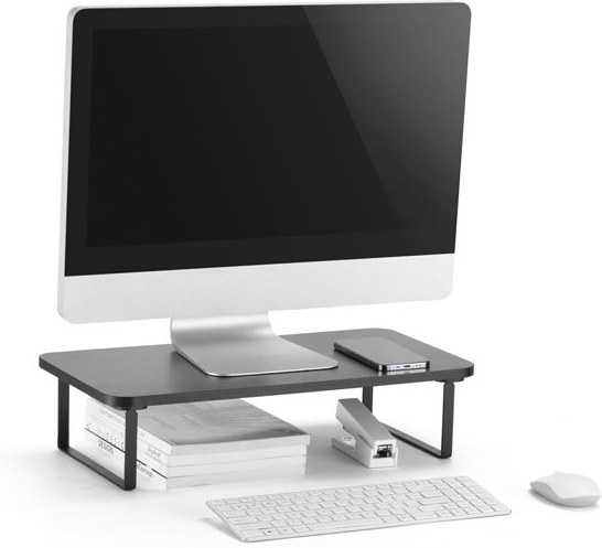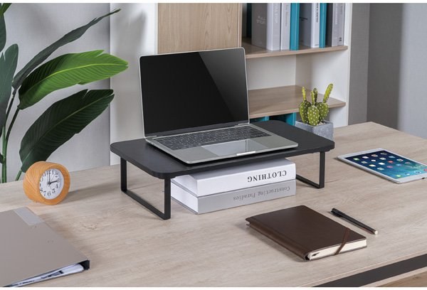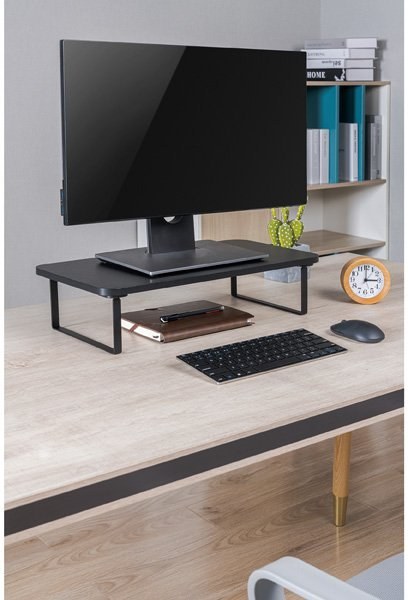 Zbavte sa bolesti hlavy, očí a krčnej chrbtice a dbajte na správne umiestnenie monitoru svojho PC či notebooku. Monitor by mal byť umiestnený približne 45 - 70 cm od očí. Horný okraj obrazovky potom vo výške očí. Zorný uhol alebo uhol medzi dvoma krajnými sledovanými bodmi vo zvislej rovine je odporúčaný v rozmedzí 0 - 60°. Drobné prispôsobenie pomocou podstavca umiestni monitor alebo notebook do optimálnej úrovne očí pre prirodzené zlepšenie držania tela. Pracujte pohodlnejšie a hlavne zdravšie. Priestor pod policou navyše umožní uschovanie nepotrebných vecí a umožní tak udržať poriadok na stole.Doska z drevo triesky