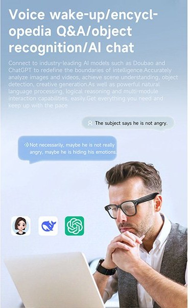 Vďaka vstavanej umelej inteligencii sa z okuliarov stáva váš osobný asistent. Dokážu rozpoznávať objekty okolo vás, automaticky vytvárať zápisy z porád a pomôžu vám aj pri štúdiu či práci. Nechýba simultánny preklad a viacjazyčný preklad v reálnom čase, takže sa bez problémov dorozumiete kdekoľvek na svete. Inteligentné funkcie pracujú okamžite a nenápadne - stačí len mať okuliare na sebe.Kľúčové vlastnosti