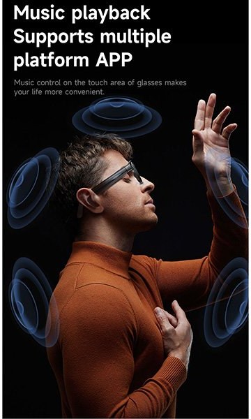 Inteligentné okuliare, návod, nabíjací kábel, vrecko na okuliare, handričku na čistenie okuliarov.