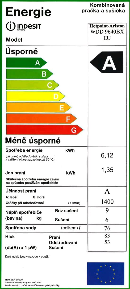 Energetická spotreba prania / pranie + sušenie: 1,35 / 6,12 kWh
