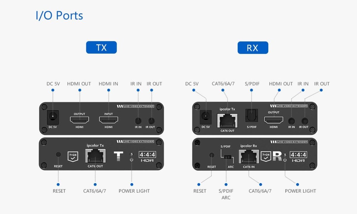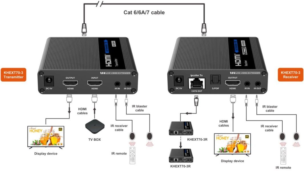 - Konektory na vysielači: vstup HDMI, výstup HDMI pre miestny monitor, konektor RJ45, napájací konektor, 2x IR konektor