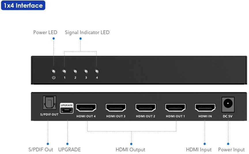 Vstup HDMI splittera zapojte HDMI káblom do zdroja signálu a výstupy zapojte do zobrazovacích jednotiek alebo monitorov.
