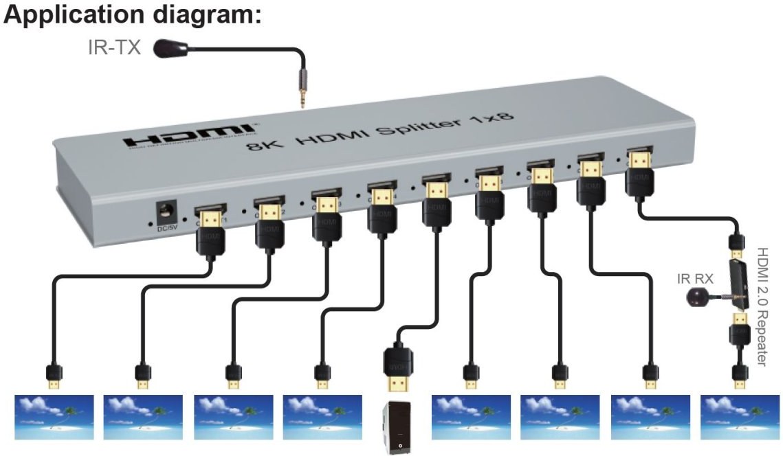 Vstup HDMI splittera zapojte HDMI káblom do zdroja signálu a výstupy zapojte do zobrazovacích jednotiek alebo monitorov.